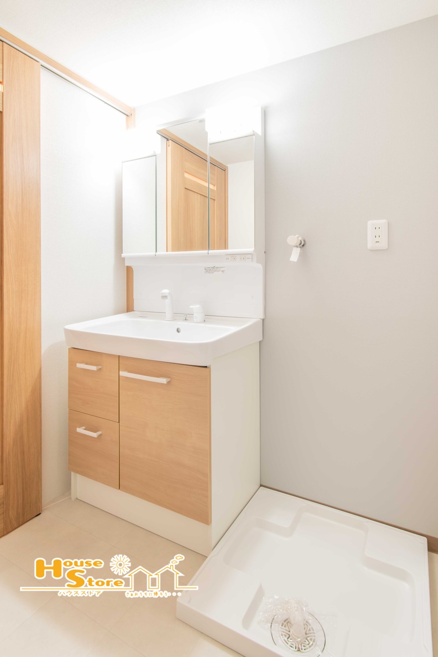 清潔感あふれる洗面化粧台!三面鏡のキャビネット収納には洗顔具をコンパクトにまとめることができ、朝の身支度もスムーズにできます♪