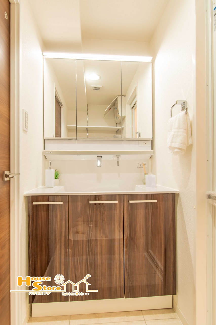 洗面台は、身だしなみを整えやすい三面鏡に収納を備えた機能的な設計です。収納力があるため整理整頓もしやすく、快適でスッキリと使えます。