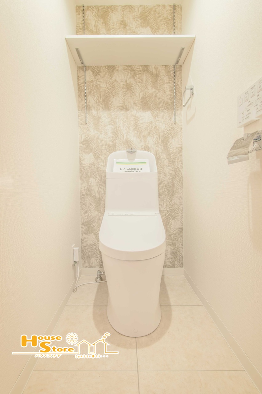 収納スペースを備えたトイレはペーパーや小物もスッキリ収納できるので空間を広く使えます。生活感のある内装で、毎日快適に利用できる空間です。