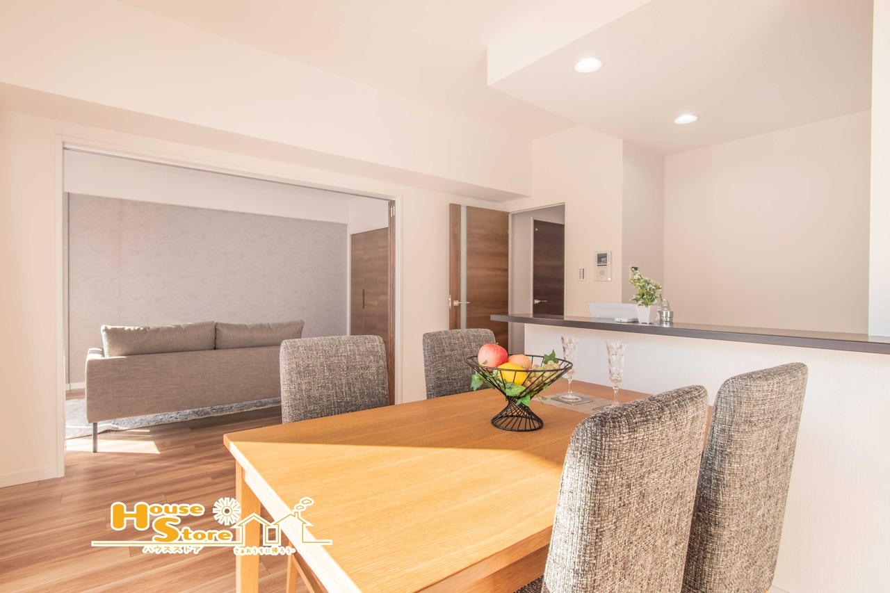 カウンター越しに食器を受け渡せるダイニングは、キッチンとの行き来がスムーズで、日々の家事を心地よくサポート。暮らしの中で自然に活用できる魅力的な空間です。