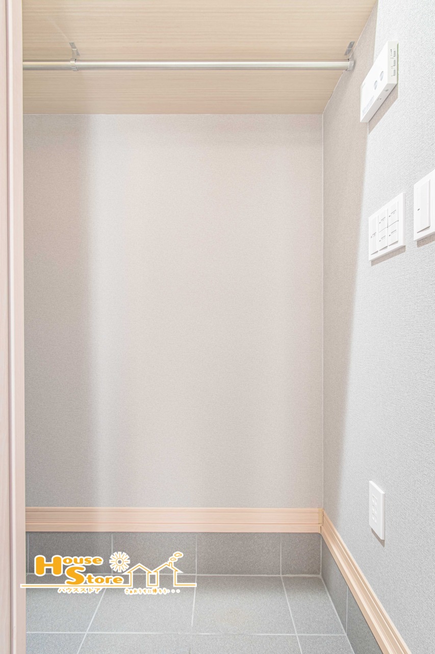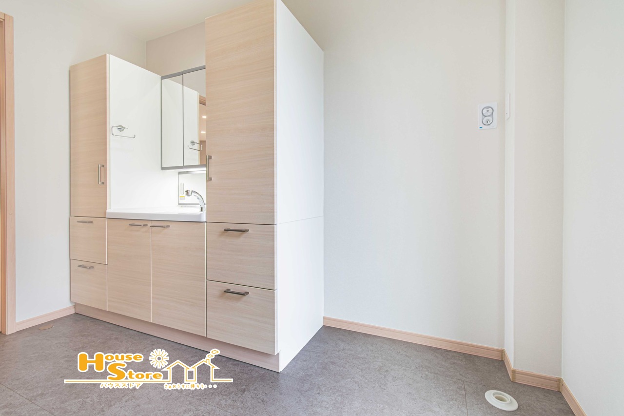 洗面室は豊富な収納でタオルや洗剤などの日用品、お着替えなどもすっきり片付きます。物がキレイにまとまり日々の清掃もスムーズにできます。