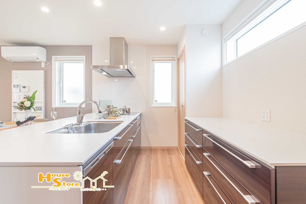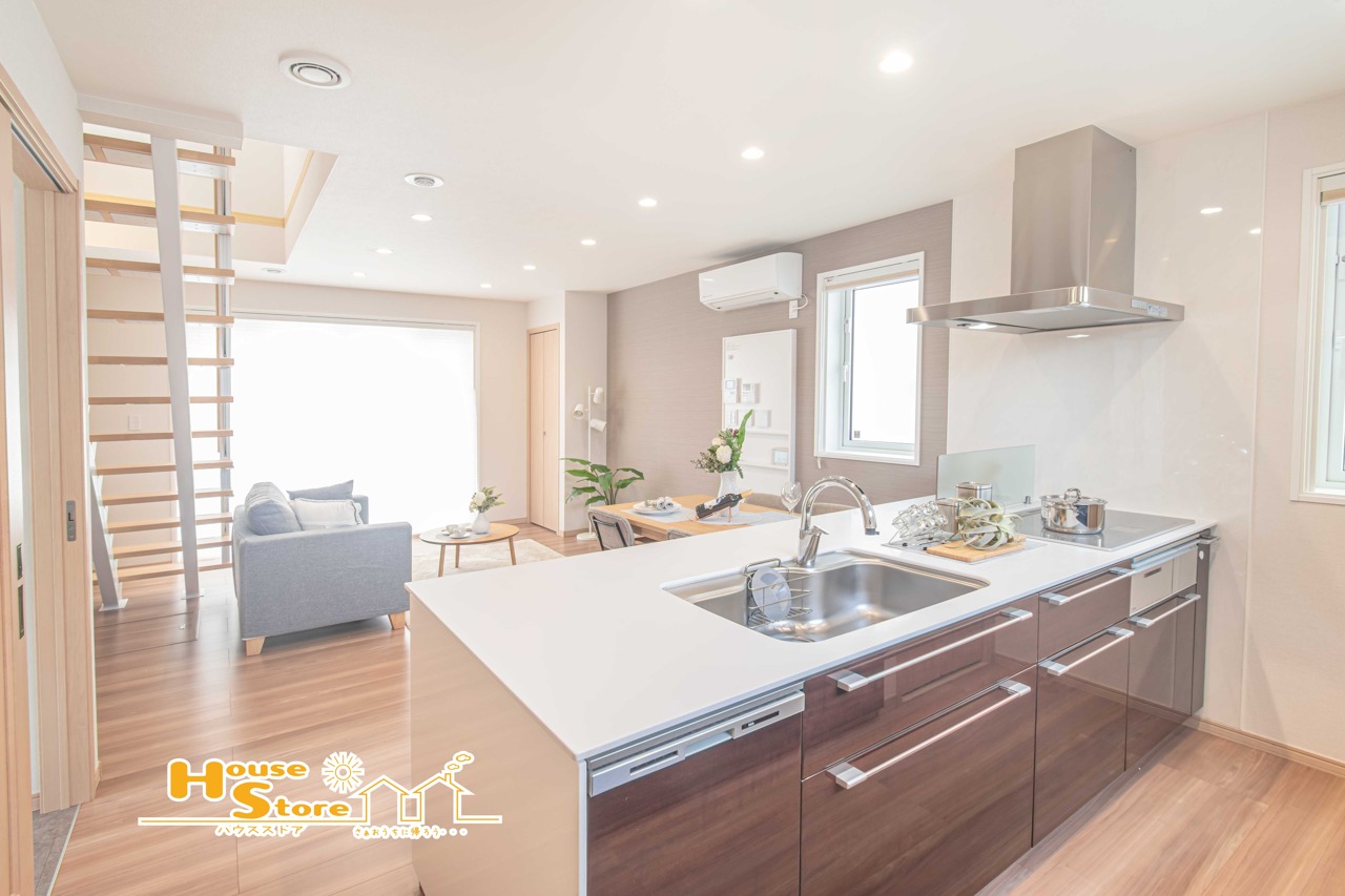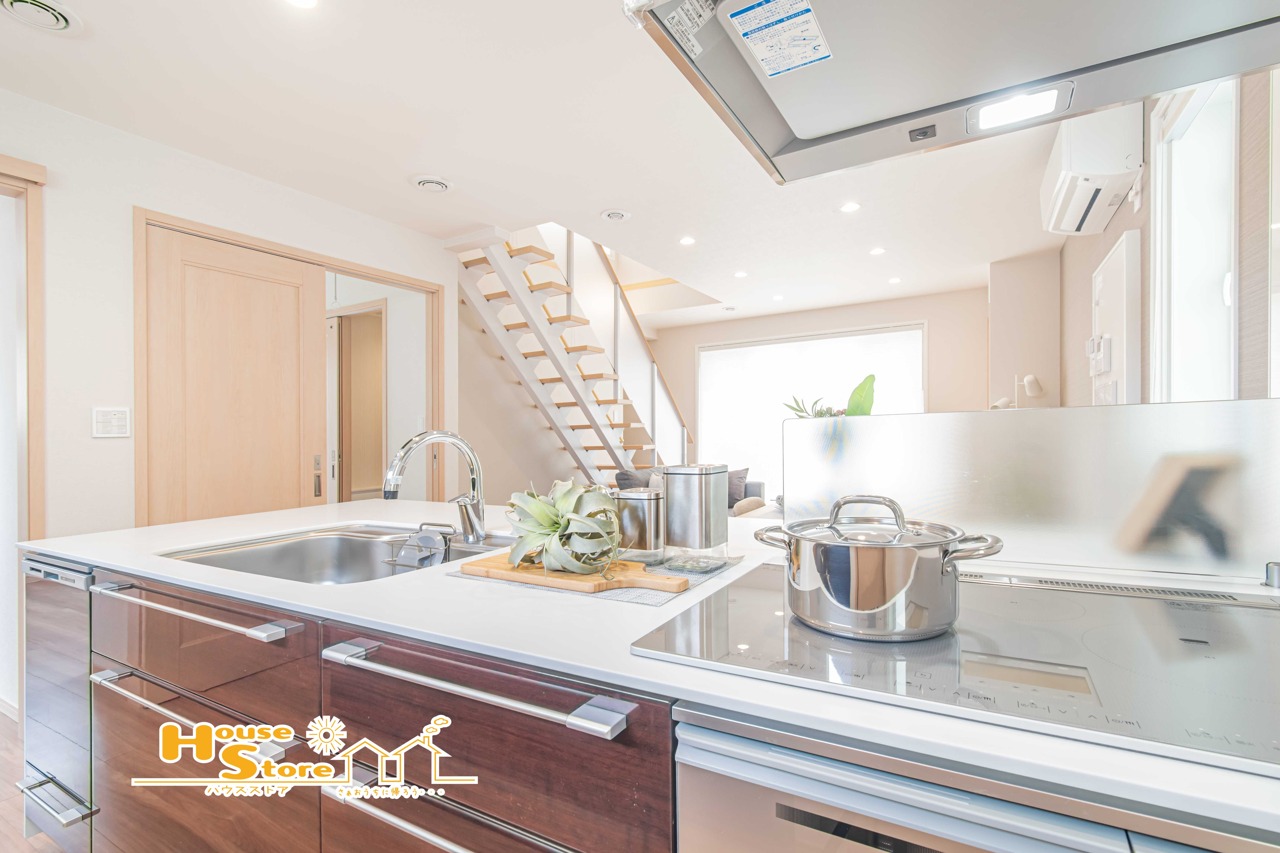 お料理をしながらリビングの様子をうかがうことができる対面式キッチン。家事の最中にお子様から目がはなれる心配がなく、子育て中の方も安心の仕様です。