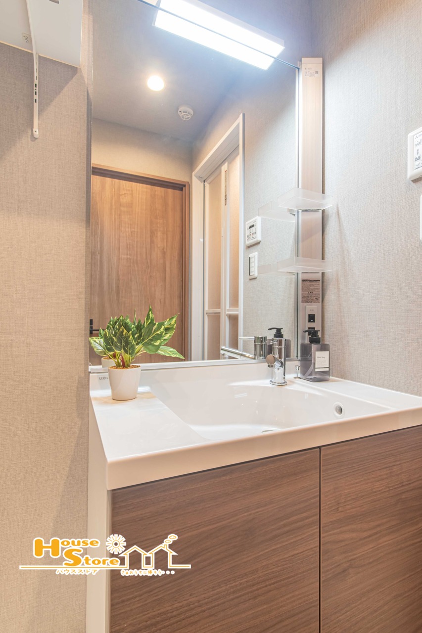 清潔感のある洗面台は、収納も備えた使いやすい設計。散らかりがちな小物もスッキリ片付きいつでも整った空間になります。