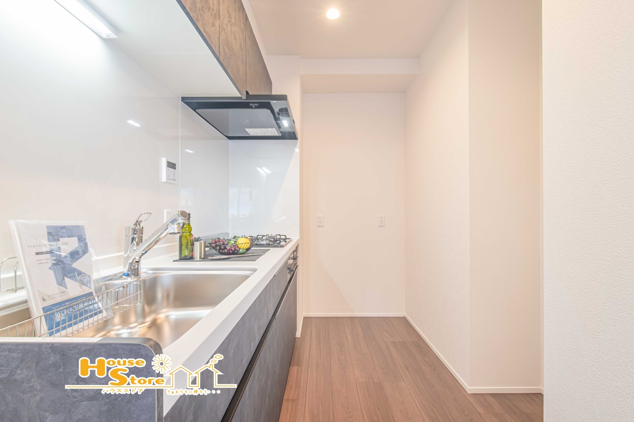 背面にゆとりを持たせたキッチンは、冷蔵庫や収納棚を置いても広々!動線にゆとりがあり毎日の家事もストレスフリーです。