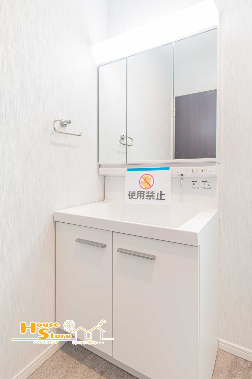 清潔感あふれる洗面化粧台!三面鏡のキャビネットや収納には洗顔具をコンパクトにまとめることができ、朝の身支度もスムーズにできます♪