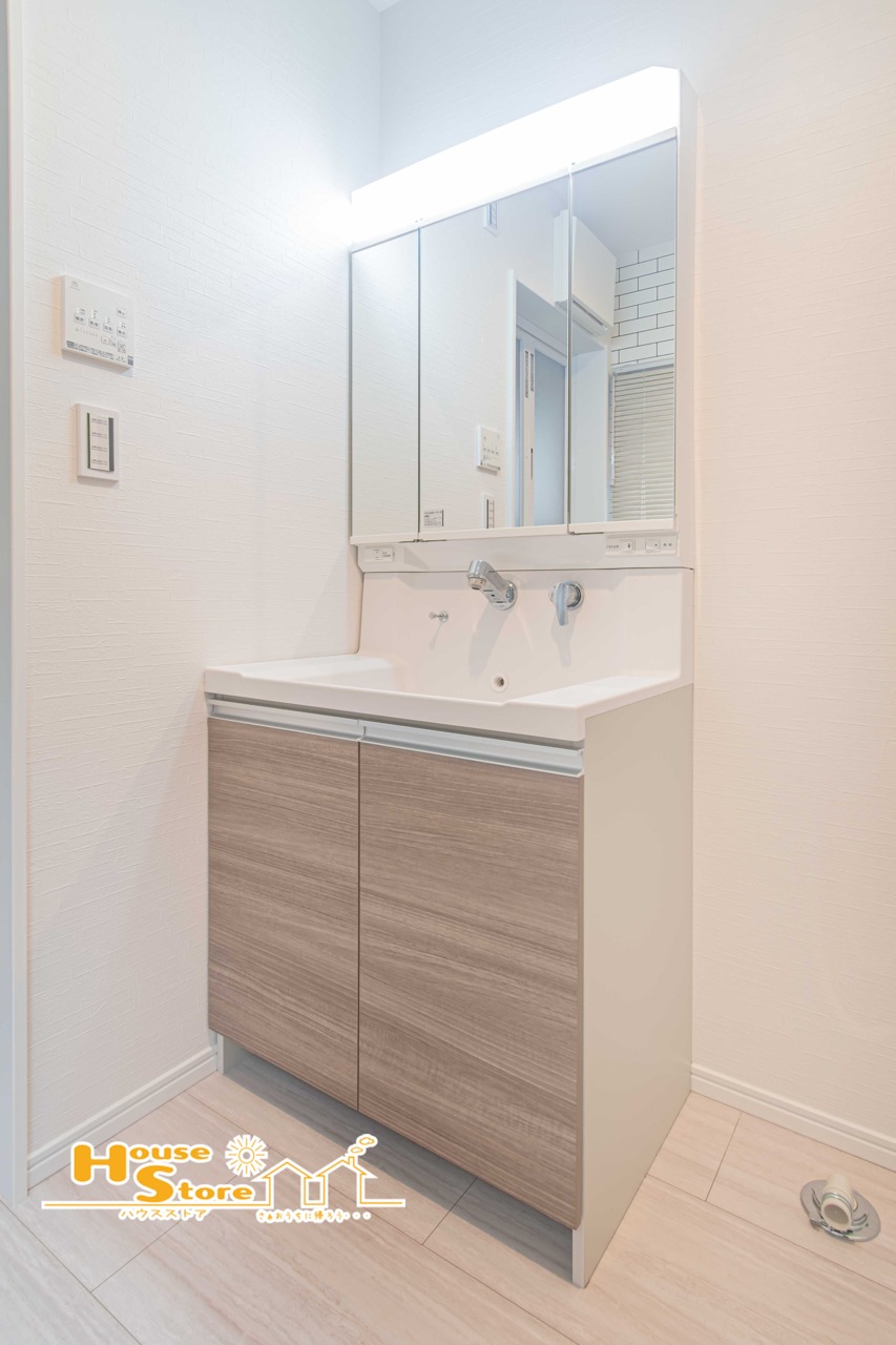 三面鏡付きの洗面台は身だしなみチェックもスムーズ。角度を変えて細かい部分まで確認できるため朝の準備がより快適になります。