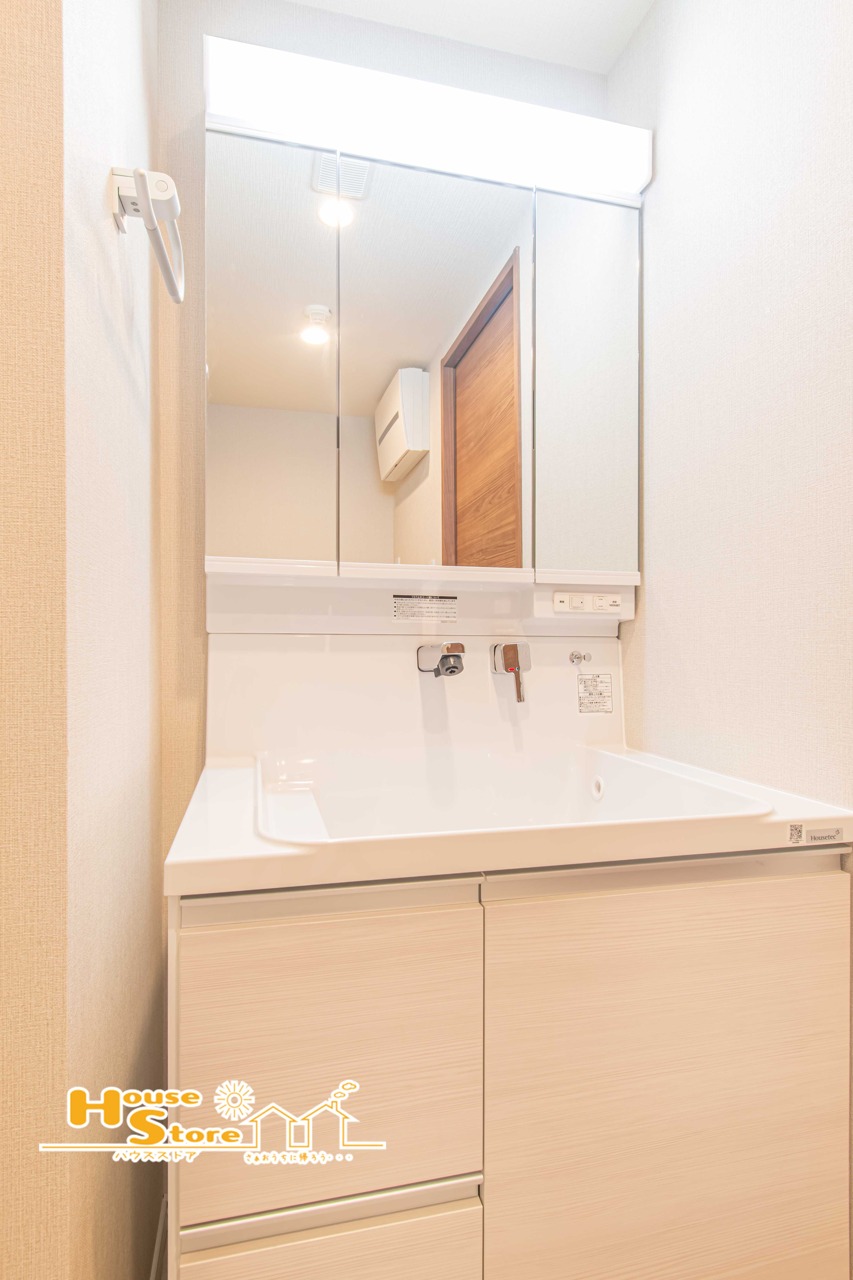 清潔感あふれる洗面化粧台!鏡面のキャビネットや収納には洗顔具をコンパクトにまとめることができ、朝の身支度もスムーズにできます♪