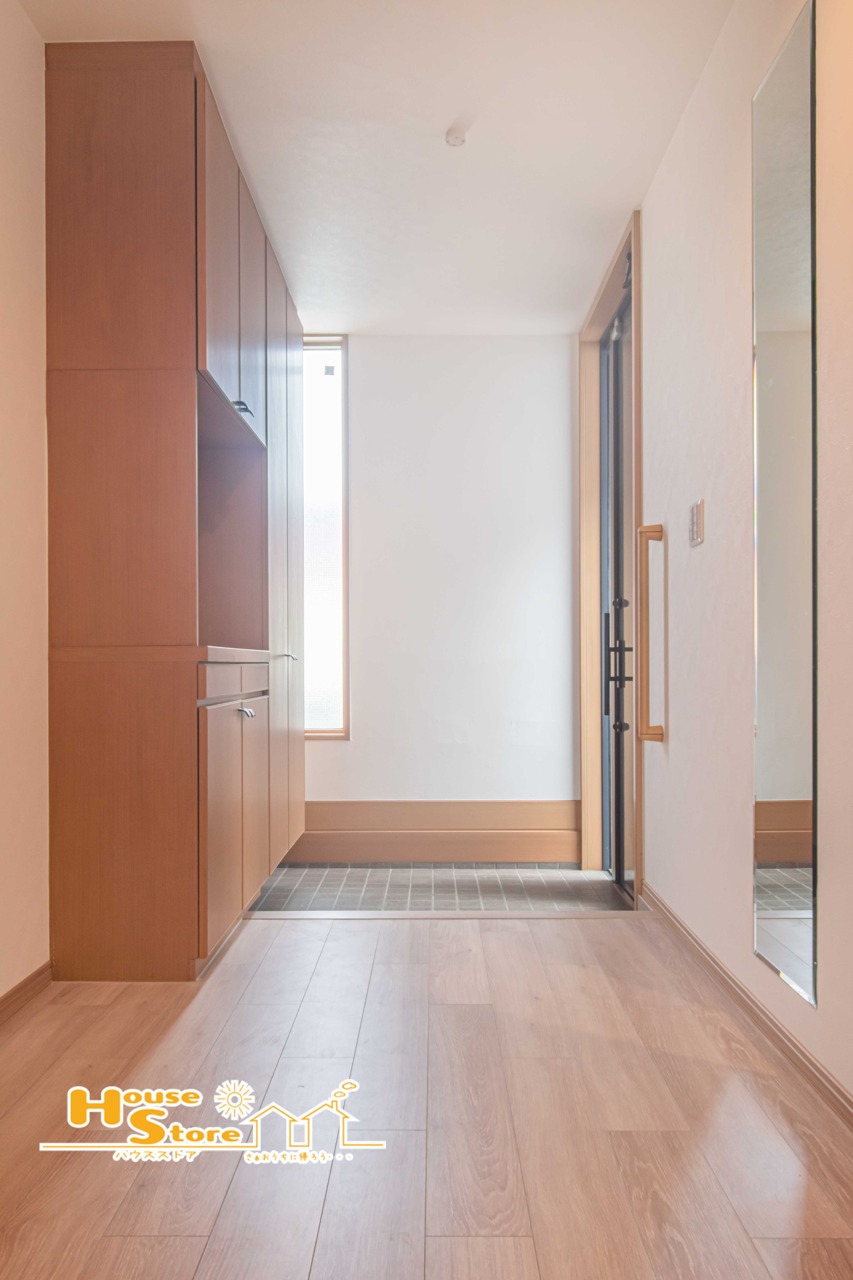 玄関には採光窓があり、自然光が入る明るい雰囲気。充実の収納で靴や掃除道具をすっきり片付けられ、清潔感のある空間を保てます。
