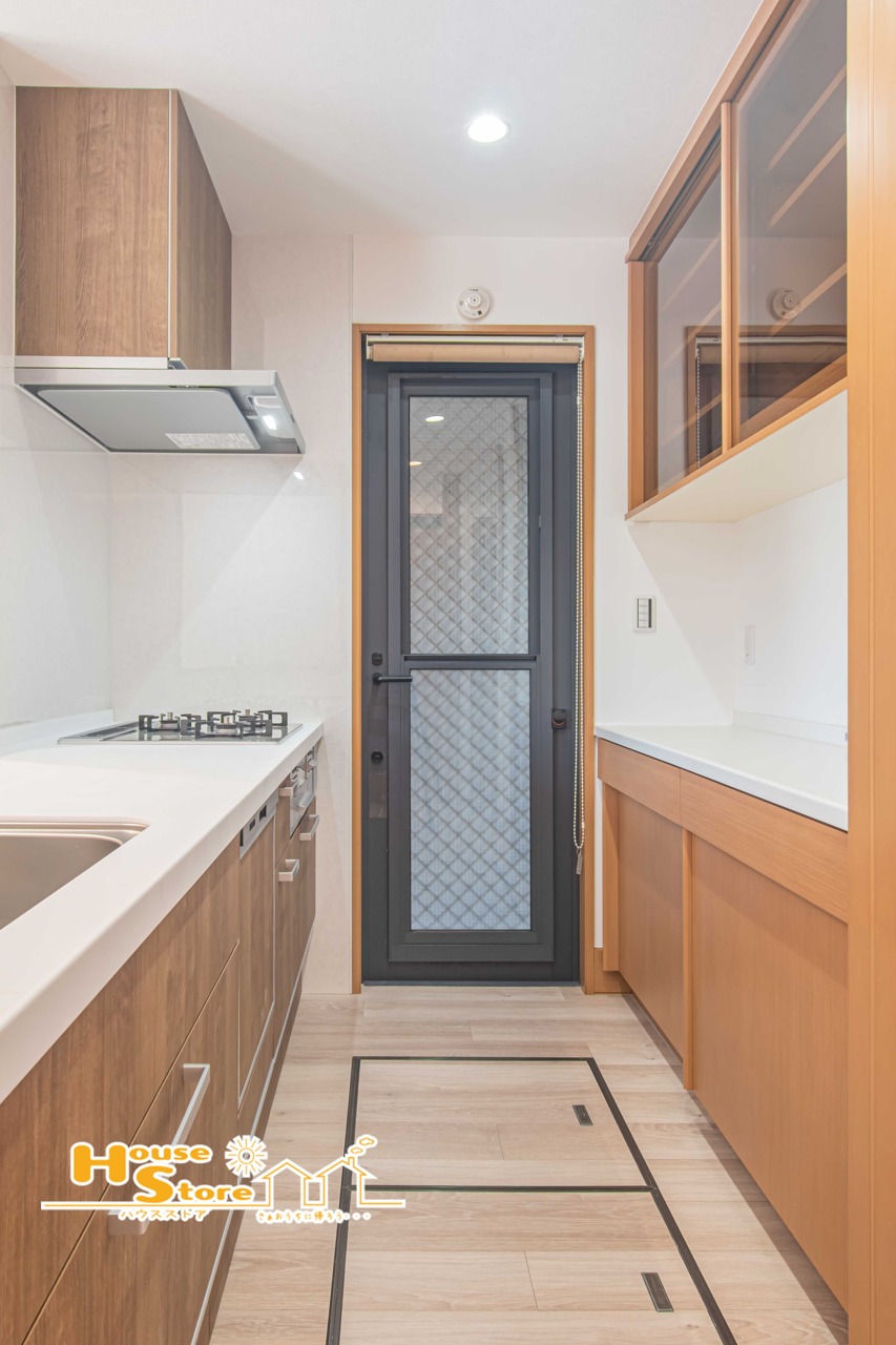 豊富な収納棚と床下収納で、食器や調理道具を整理整頓しやすいキッチン。勝手口も完備しており、家事動線が良く便利に使えます。