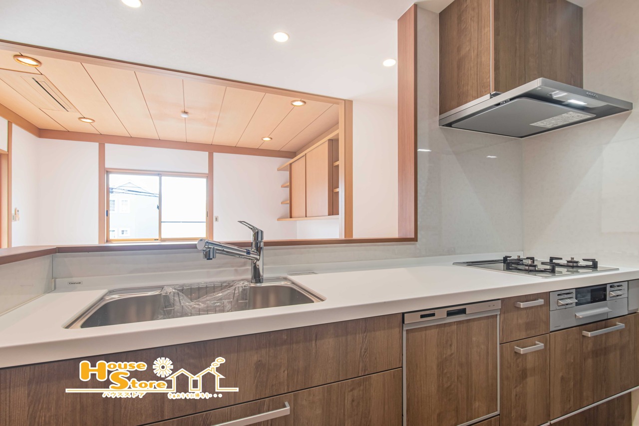 カウンターキッチンはリビングとつながり、家族との会話を楽しみながら家事ができます。開放感があり、料理や片付けもスムーズに行える快適なキッチンです。