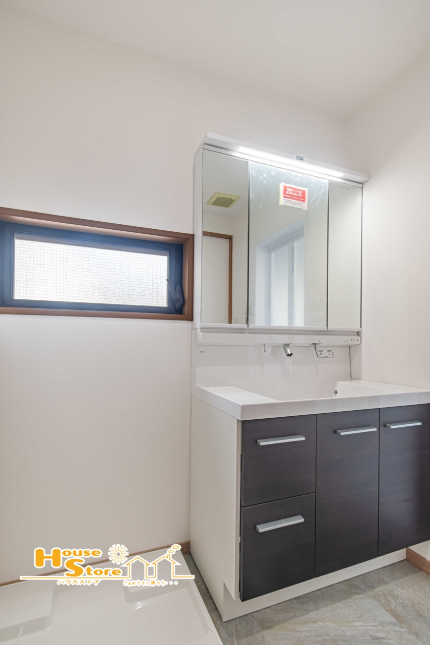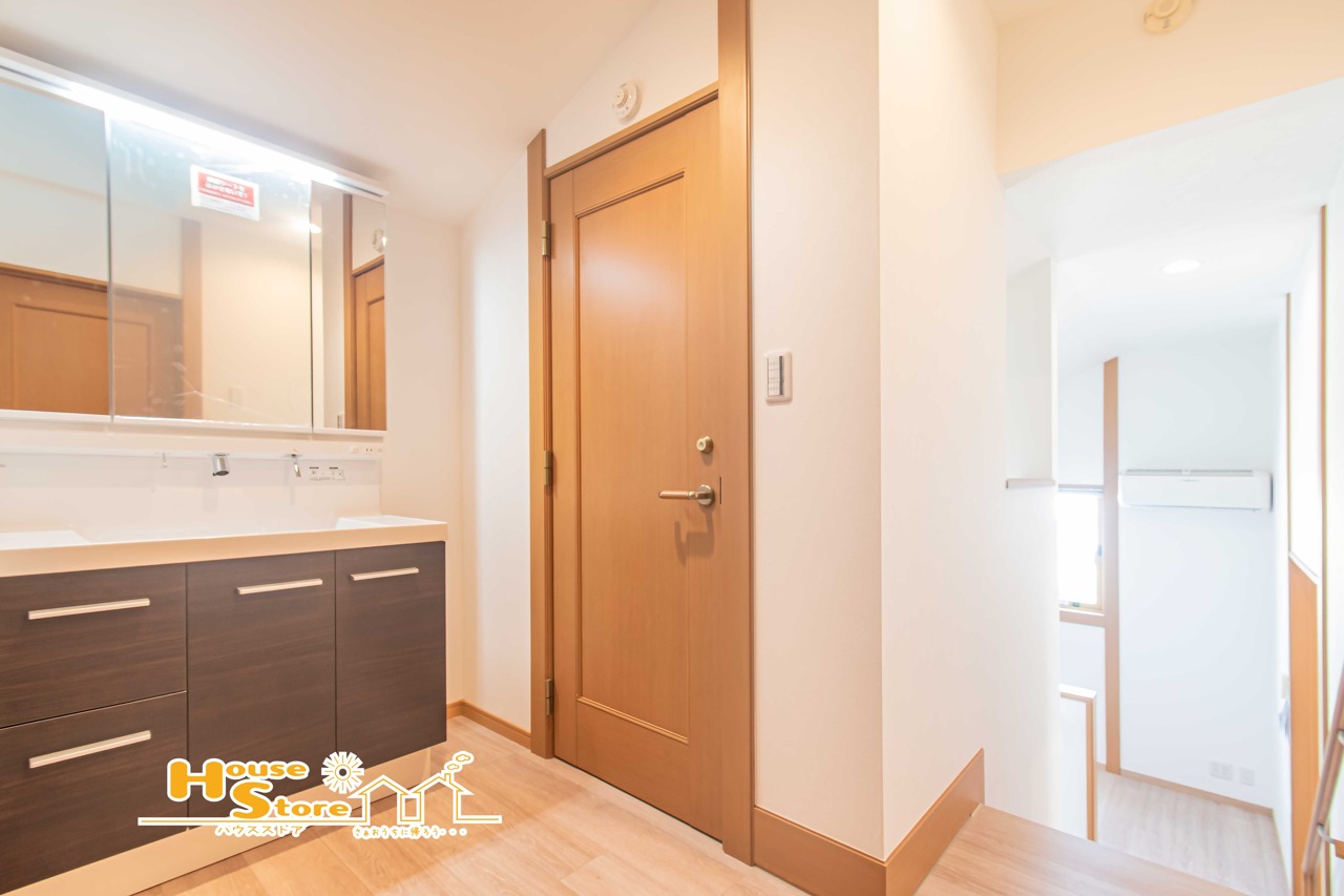 三面鏡を備えた2階洗面台は、家族での使用に便利。化粧品やタオルを鏡裏や下部収納に整理でき、忙しい朝の時間も効率よく使えます。