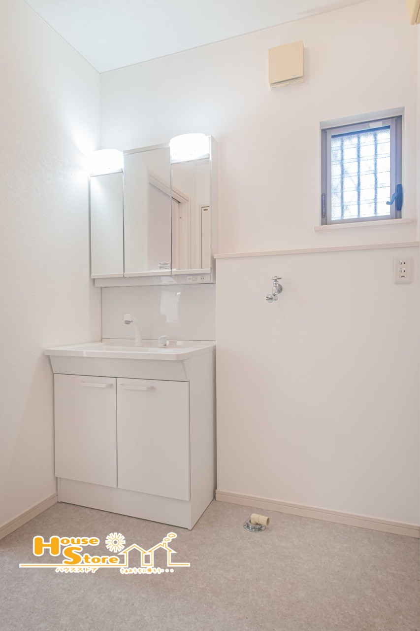 豊富な収納を備えた三面鏡付き洗面台。タオルや化粧品、日用品もすっきりと収まり、毎日の身支度がスムーズにできる使い勝手の良い空間です。