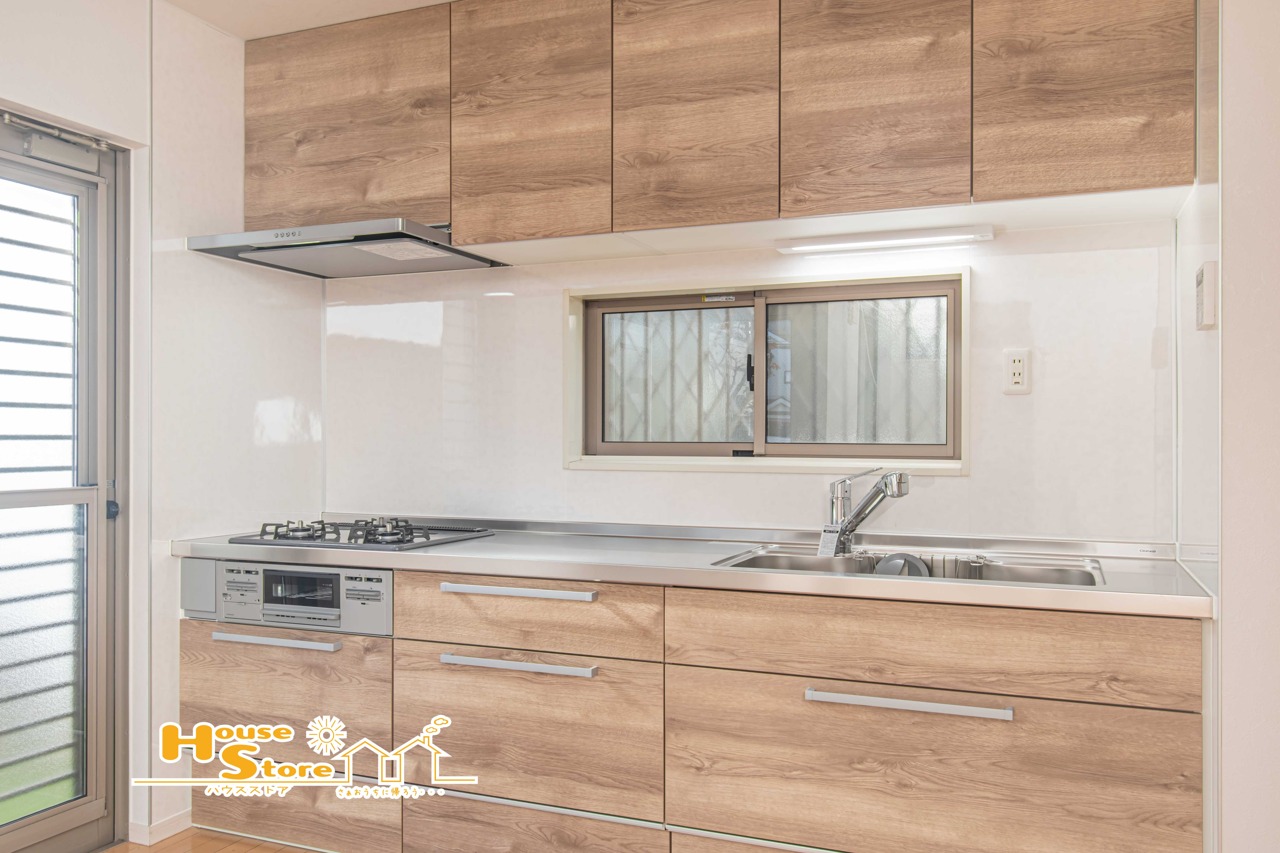 背面スペースにゆとりを確保した独立型キッチンで、毎日の調理もスムーズに。大容量の食器棚付きで食器や調理道具もすっきり収納できます。