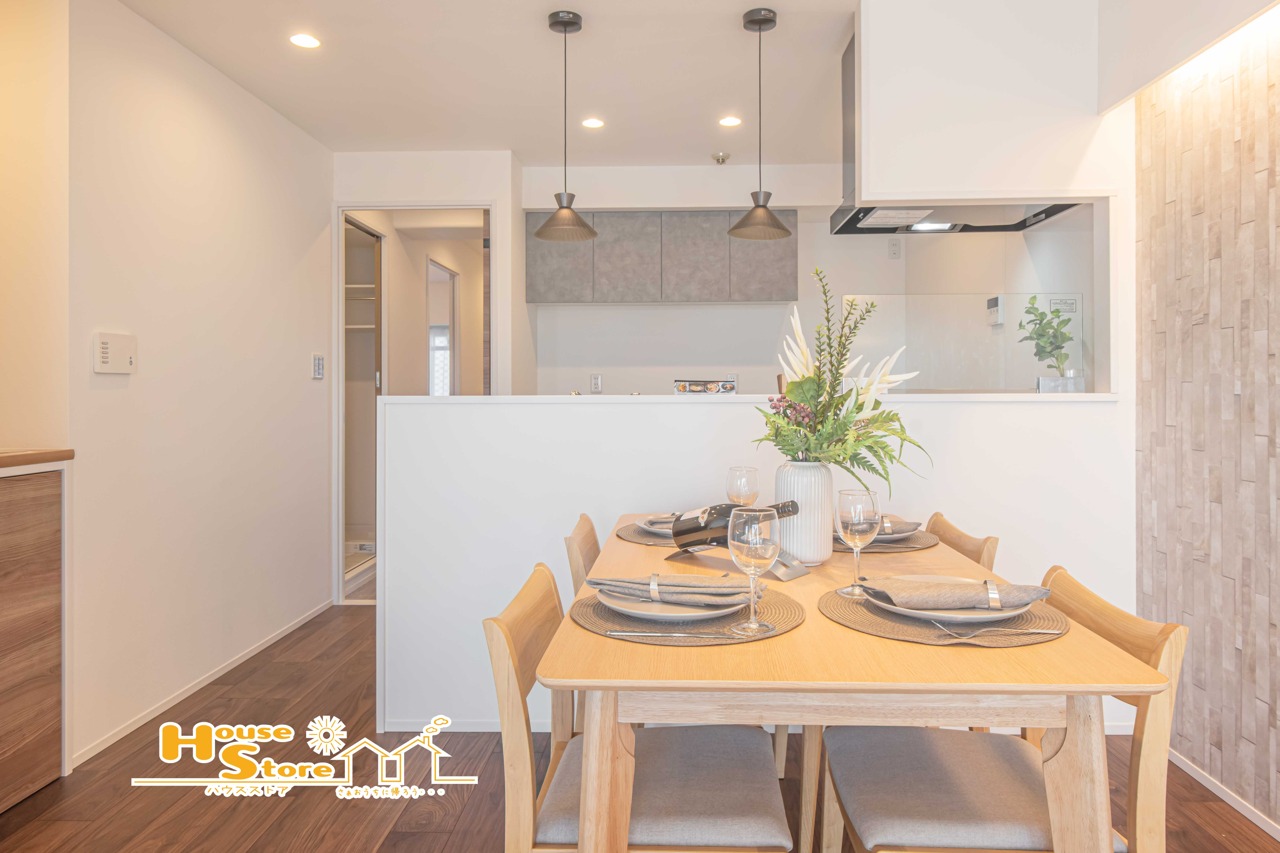 カウンター越しに食器を受け渡せるダイニングは、キッチンとの行き来がスムーズで、日々の家事を心地よくサポート。暮らしの中で自然に活用できる魅力的な空間です。