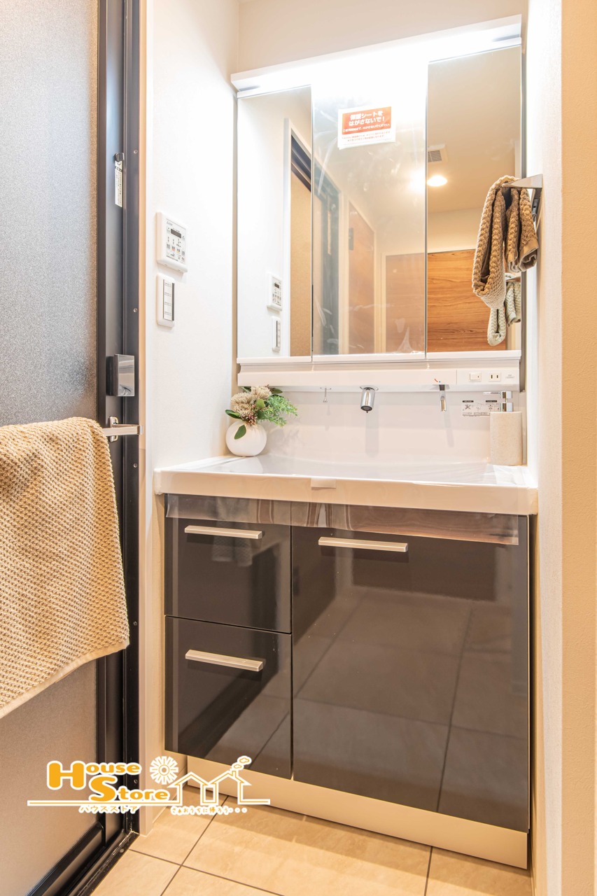 洗面台は、身だしなみを整えやすい三面鏡に収納を備えた機能的な設計です。収納力があるため整理整頓もしやすく、快適でスッキリと使えます。
