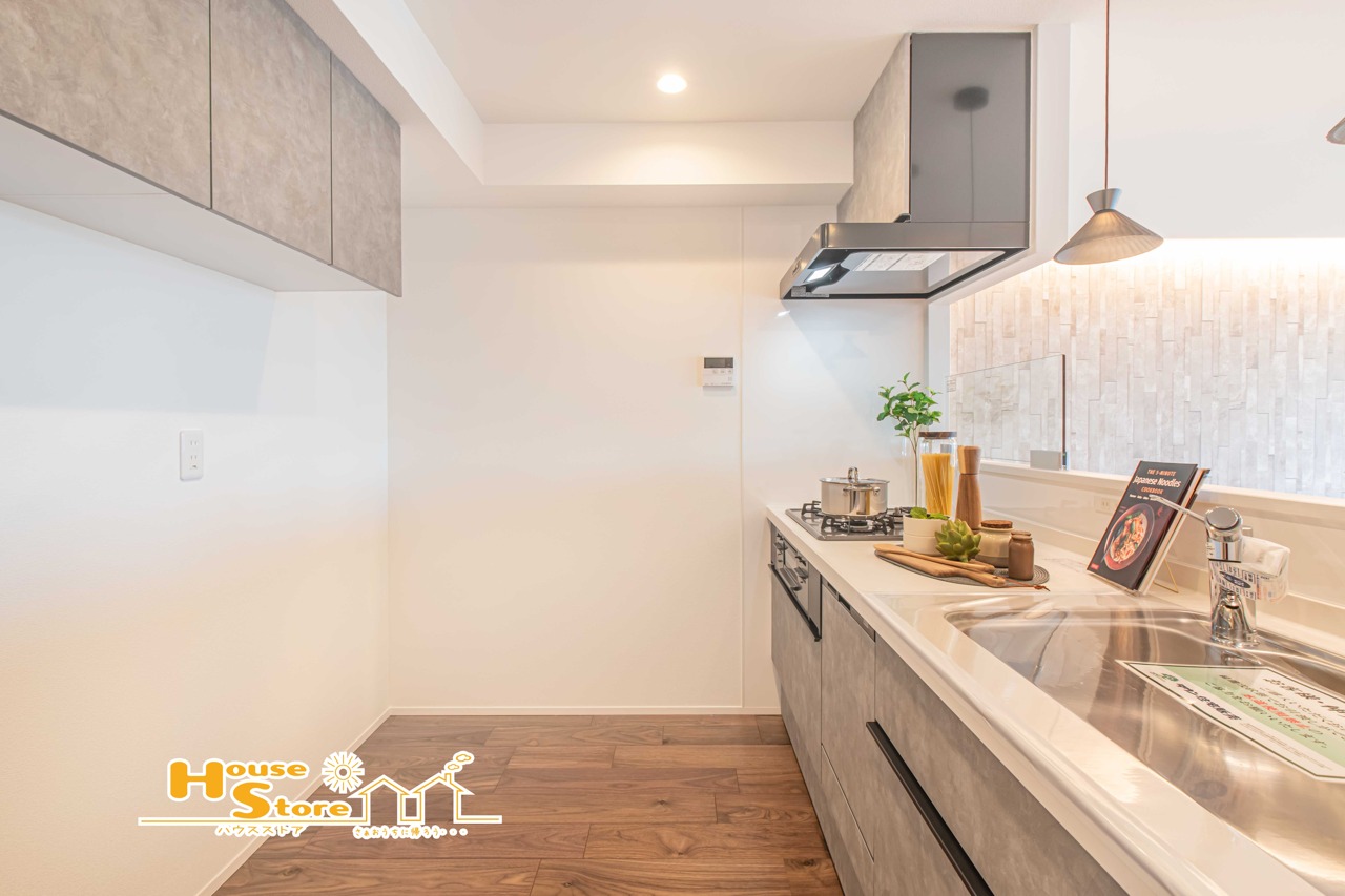 機能性に優れたキッチンは、充実した設備で快適な調理をサポート。吊戸棚やスライド式収納も充実してキッチン回りの道具もスッキリまとめられます。
