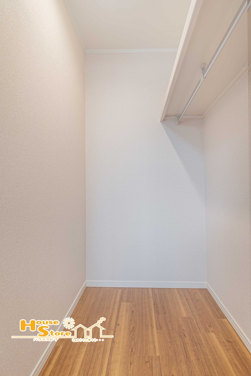 奥行きのあるウォークインクローゼットにはハンガーパイプが設置されており多くの衣類をスッキリ収納できます。シーズンごとに着なくなるコートやシワになりやすい衣服をキレイに収納できるのが魅力的です。