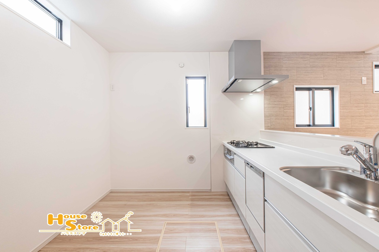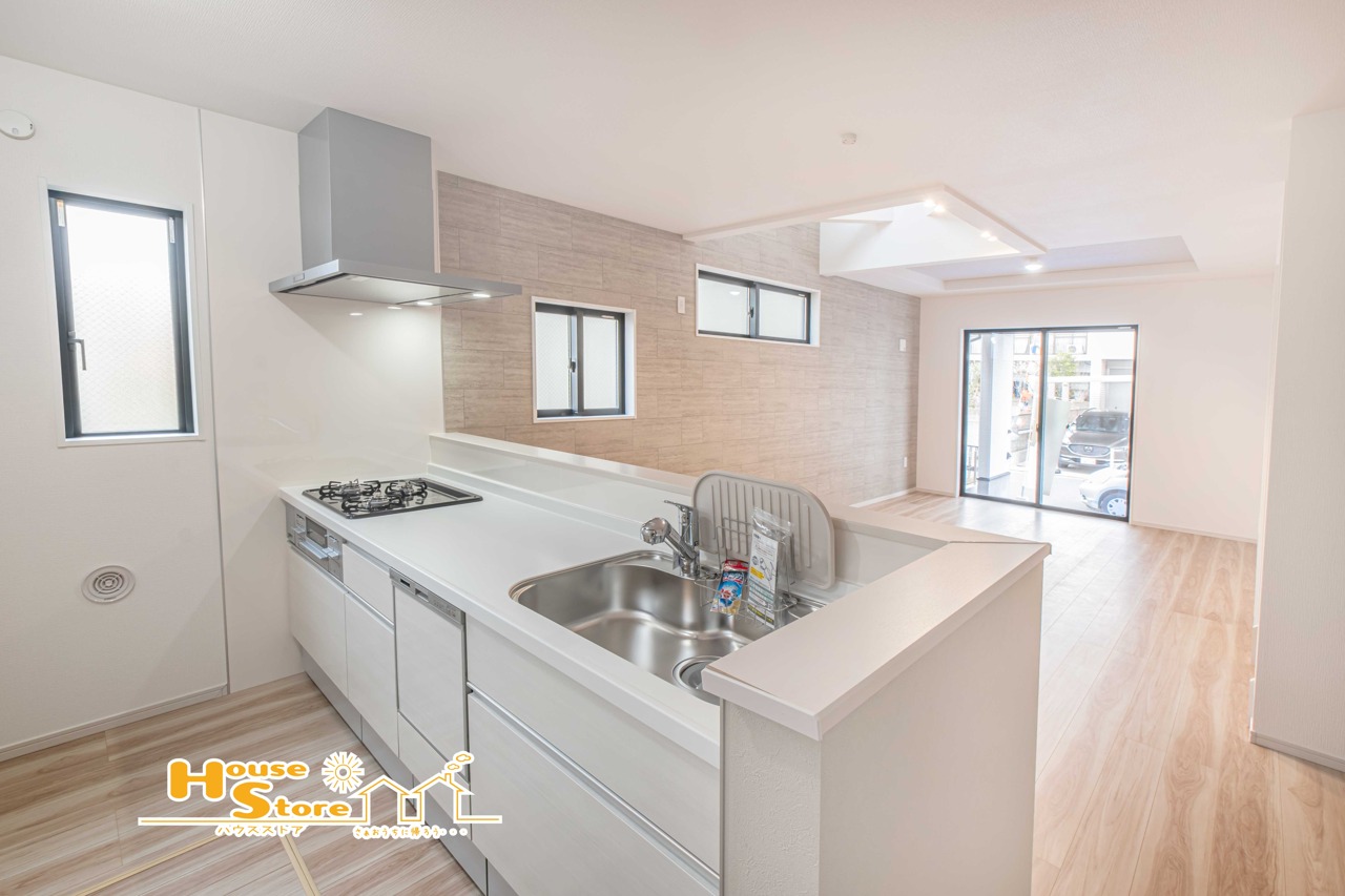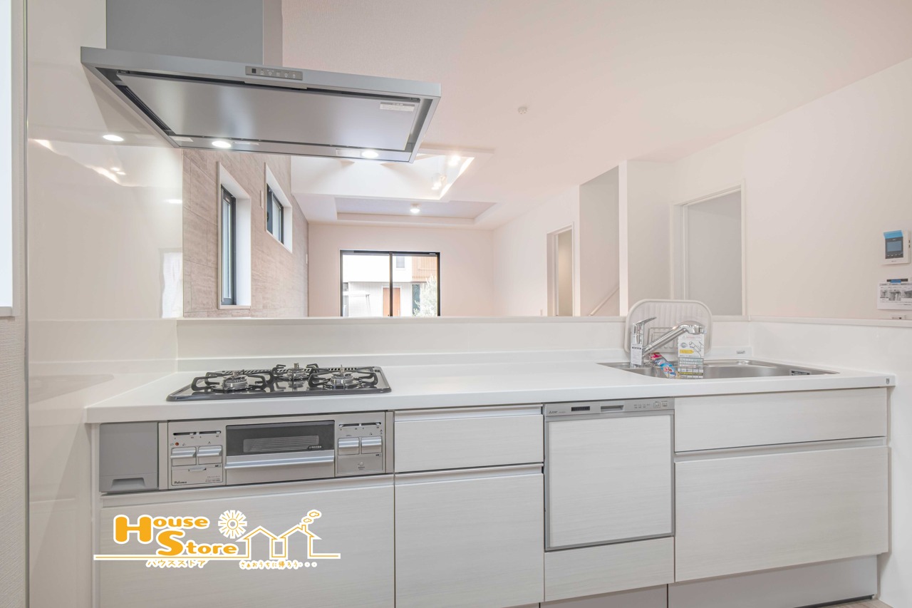 ダイニングと向き合う対面式キッチンは、家事動線を効率化し、配膳や片付けを快適に。日常のひとときも心地よく過ごせる空間です。