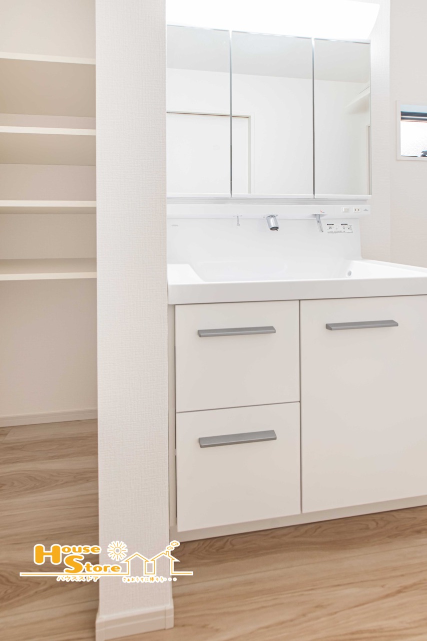 洗面室は豊富な収納でタオルや洗剤などの日用品、お着替えなどもすっきり片付きます。物がキレイにまとまり日々の清掃もスムーズにできます。