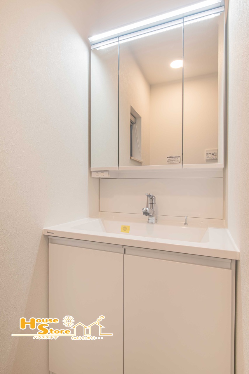清潔感あふれる洗面化粧台!三面鏡のキャビネットや収納には洗顔具をコンパクトにまとめることができ、朝の身支度もスムーズにできます♪
