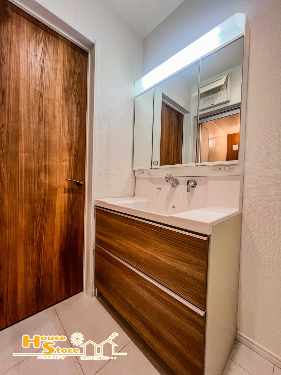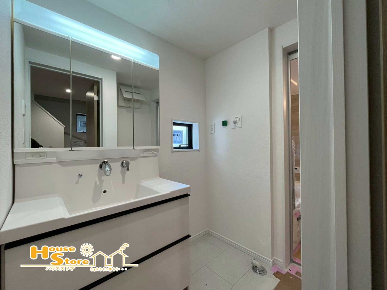 3号棟 洗面台は、身だしなみを整えやすい三面鏡に収納を備えた機能的な設計です。収納力があるため整理整頓もしやすく、快適でスッキリと使えます。 2026/04/11m