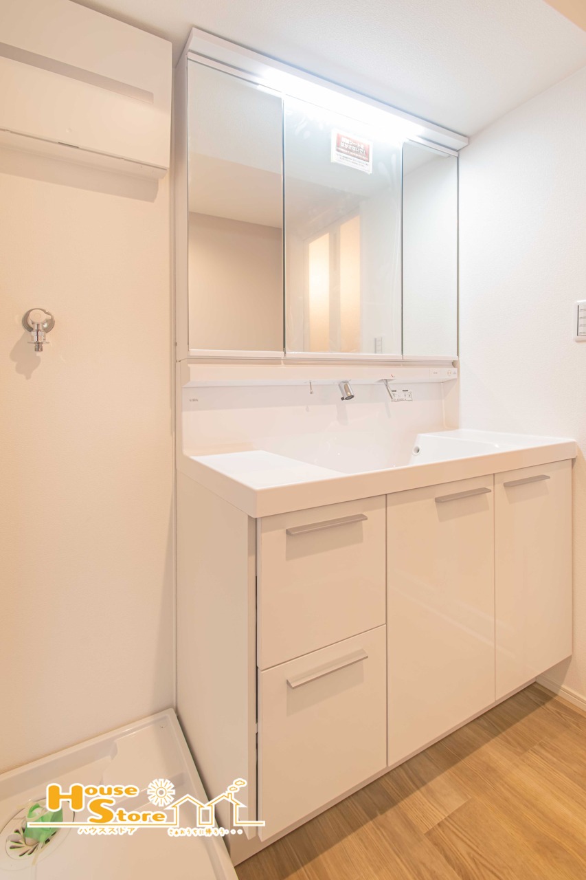 三面鏡付きの洗面台は、身支度がしやすく、引き戸タイプの収納も備えているため、化粧品や小物をすっきり整理できます。毎日の準備がスムーズに行える、使い勝手の良い洗面空間です。