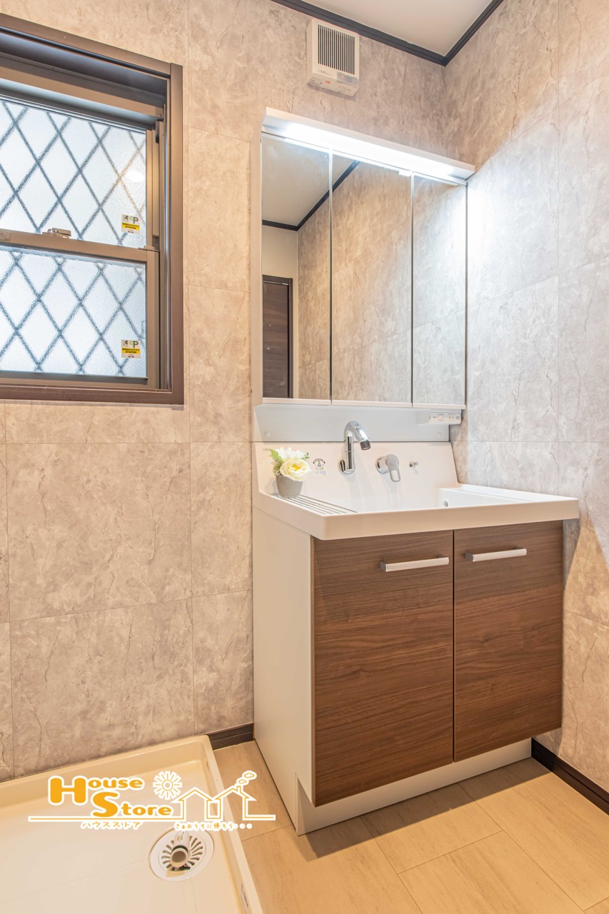 機能的な三面鏡洗面台は、使いやすさと収納力を兼ね備えた仕様。洗面まわりが整いやすく、忙しい朝も落ち着いて身支度ができそうです。