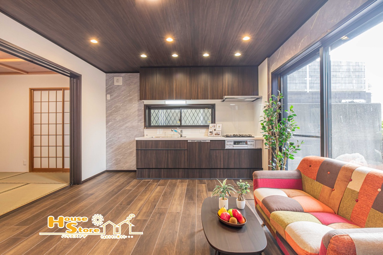落ち着きのある雰囲気のリビングは、和室やキッチンと美しく調和し、開放感のある伸びやかな空間に。住まう方の毎日に、安心感と穏やかな時間を添えてくれます。 ※家具調度品は見本となります。