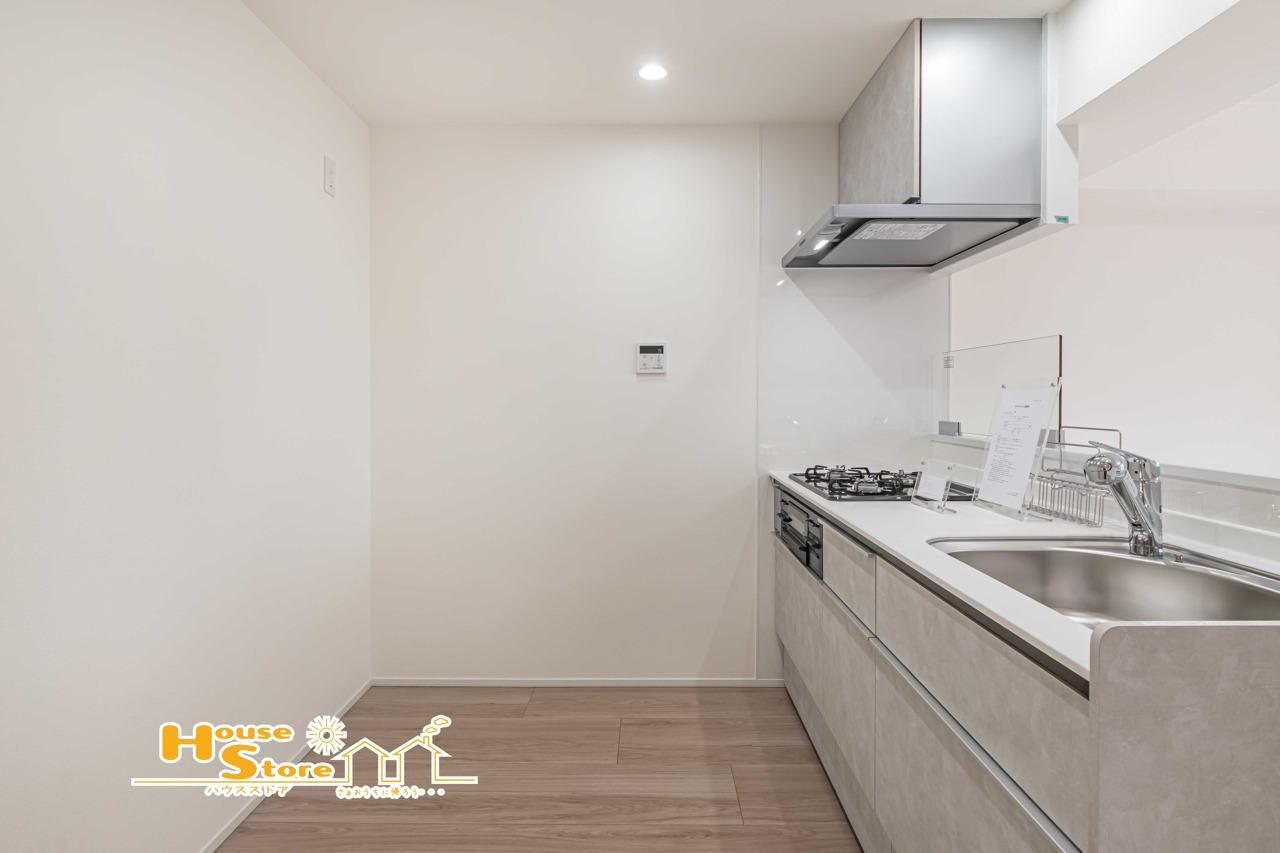 ゆとりある広さを確保したキッチンスペース。背面に冷蔵庫や食器棚を配置しても動線にゆとりがあり、快適にお使いいただけます。オートバススイッチも備え、家事動線にも配慮された機能的な設計です。