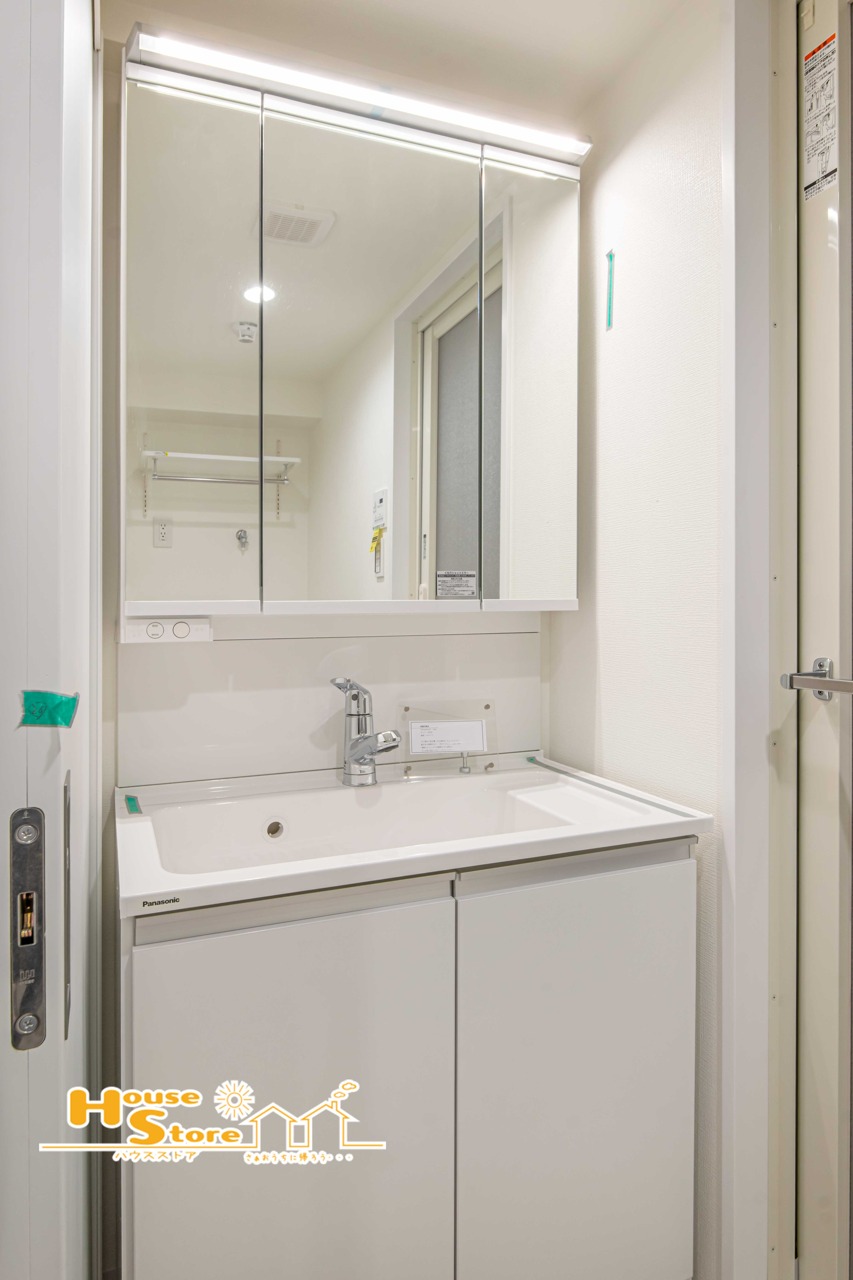三面鏡を備えた洗面台は、身支度のしやすさが魅力。鏡裏のキャビネットは細かな物の収納にも適しており、洗面まわりをすっきりとお使いいただけます。