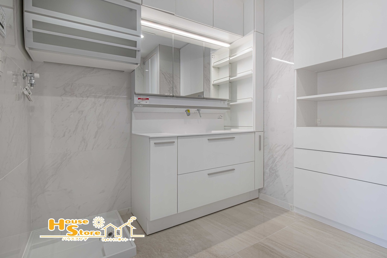 洗面室は豊富な収納でタオルや洗剤などの日用品、お着替えなどもすっきり片付きます。物がキレイにまとまり日々の清掃もスムーズにできます。