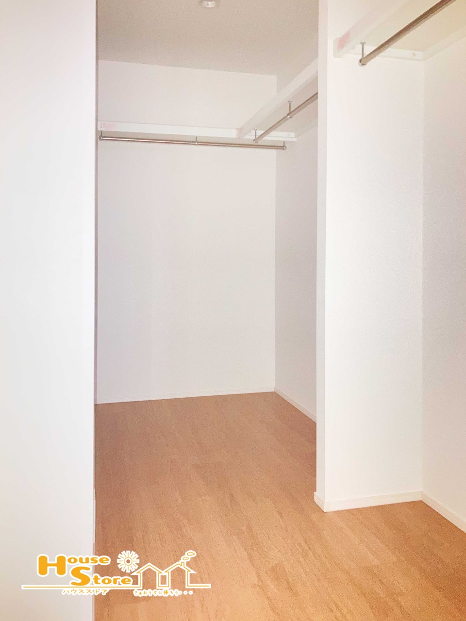 奥行きのあるウォークインクローゼットは、ハンガーパイプで衣類を効率的に収納。コートやシワになりやすい服も整然と保管でき、お出かけのコーディネートもスムーズにまとめられます。