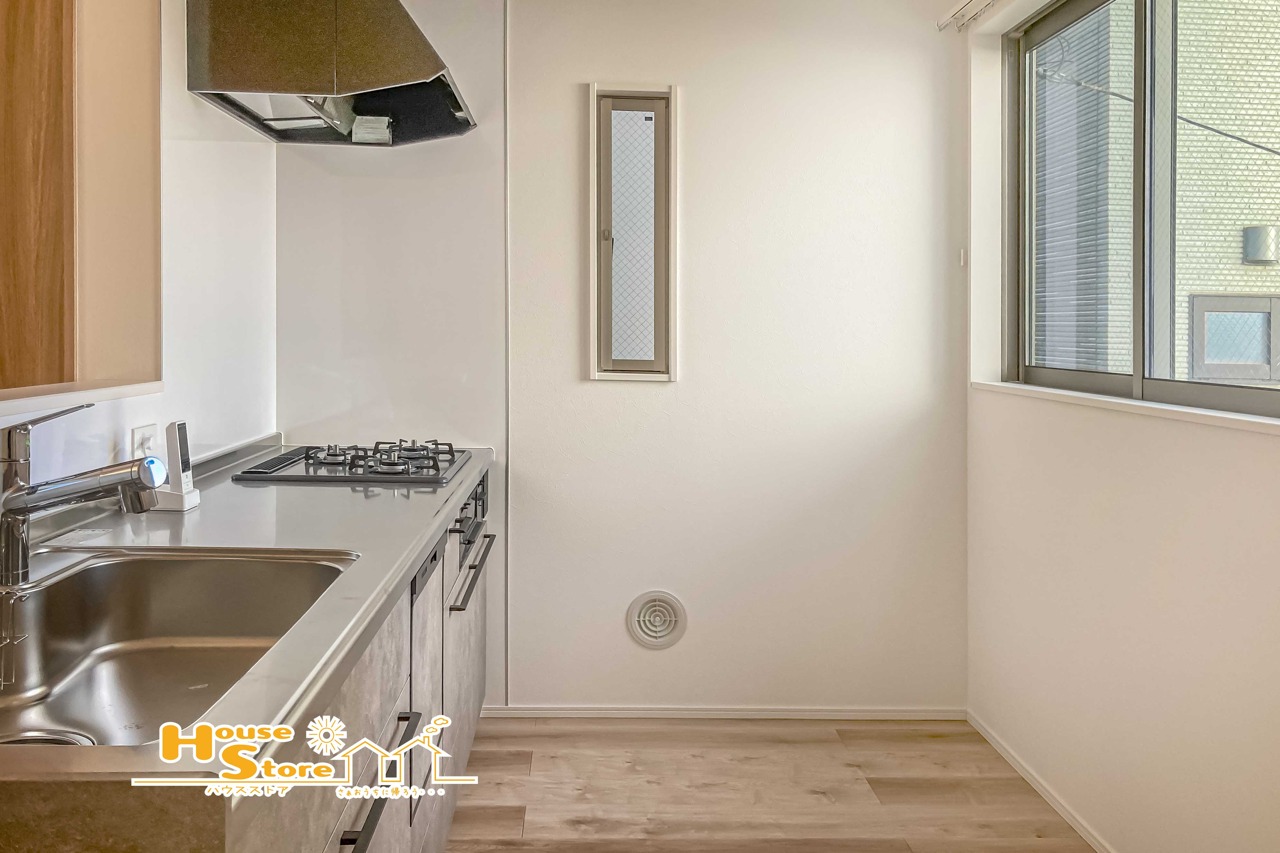 窓から明るい光が差し込むキッチンは、換気扇だけでなく窓を開けて自然換気も可能。快適に調理が楽しめます。