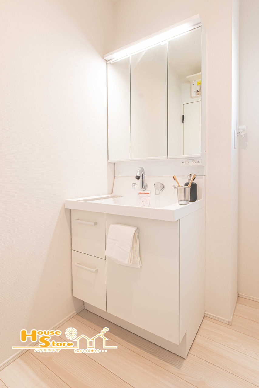 収納スペースを備えた三面鏡付き洗面台。身支度や家事動線にも配慮された使い勝手の良い空間は、毎日の快適を支えます。