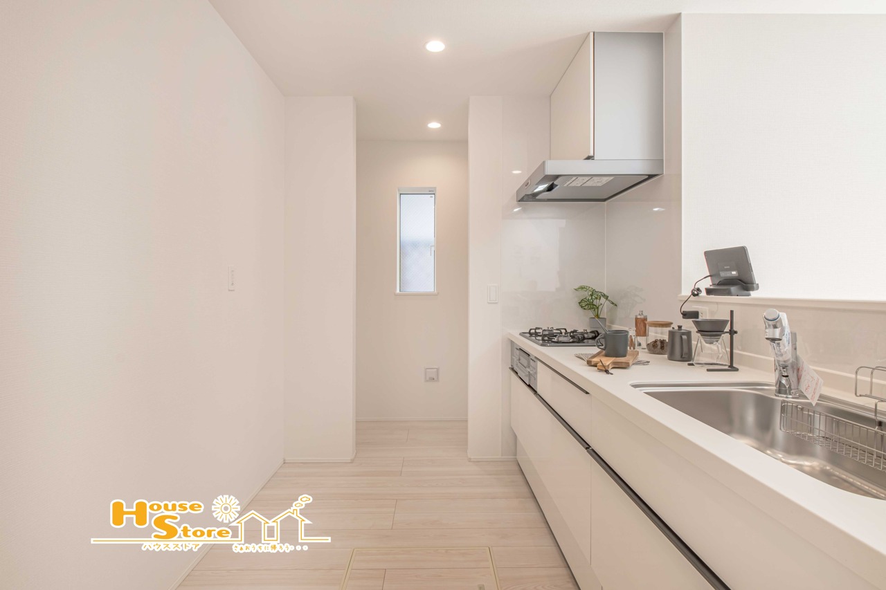 背面スペースにゆとりを確保したカウンターキッチン。キッチン奥にはパントリーを設け食材のストックや日用品を整理しやすく家事動線にも配慮された空間です。