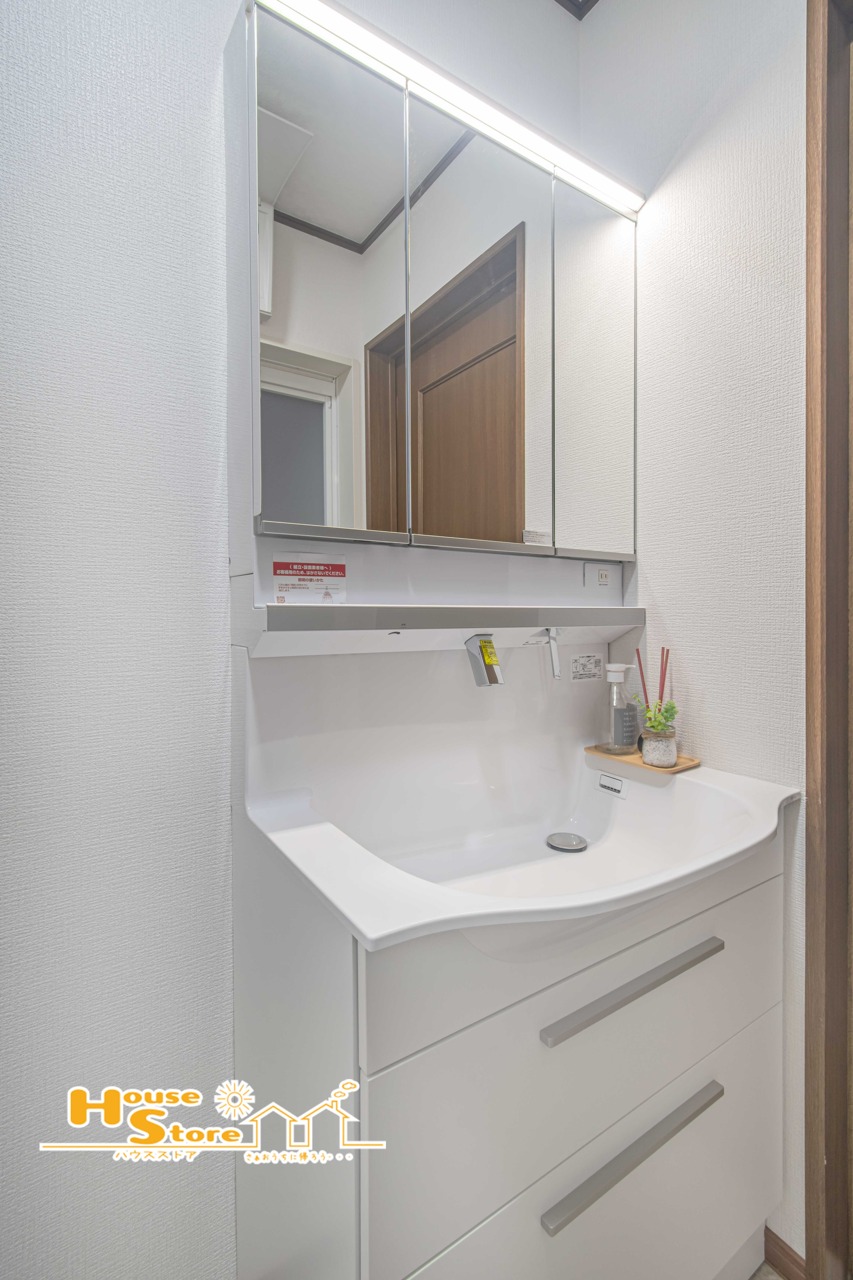 清潔感あふれる洗面化粧台!三面鏡のキャビネットや収納には洗顔具をコンパクトにまとめることができ、朝の身支度もスムーズにできます♪