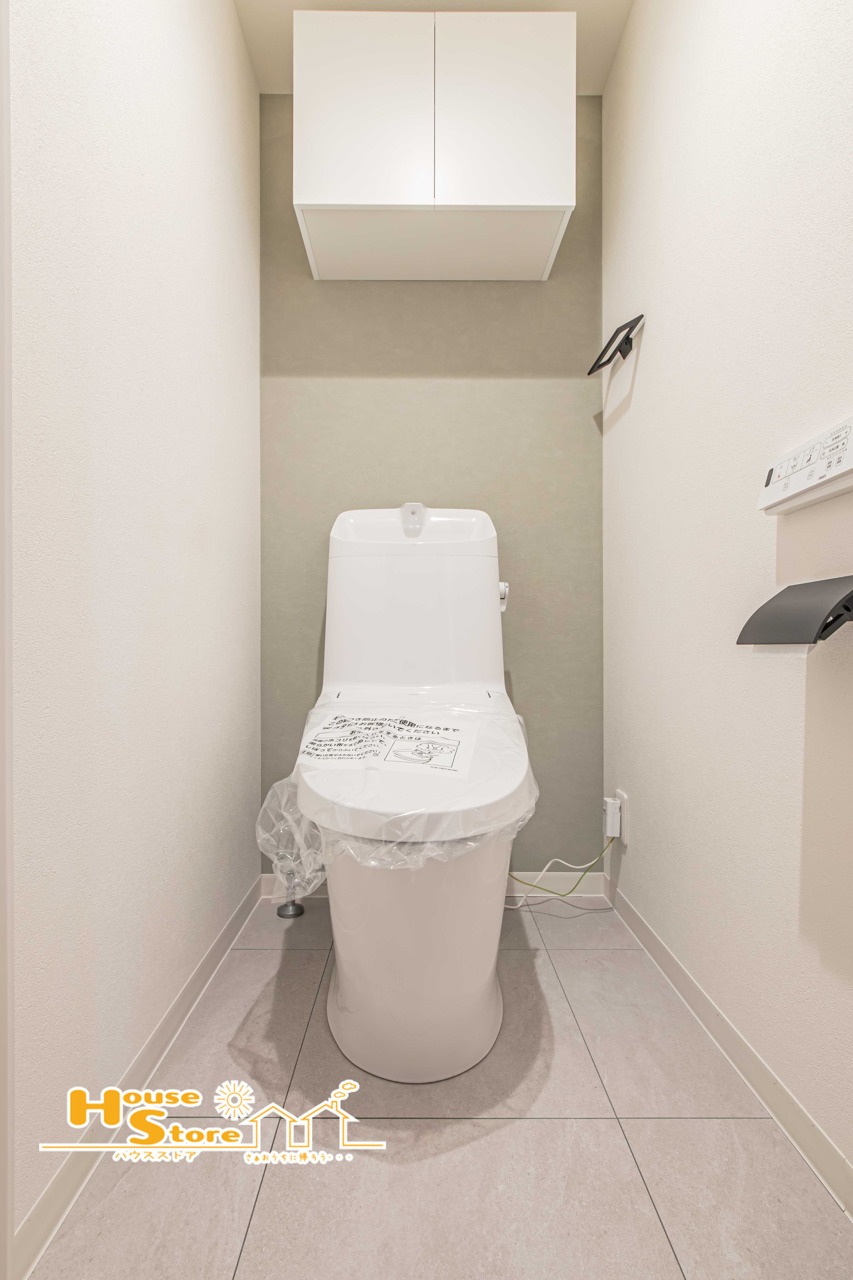 温水洗浄を備えた清潔感のあるトイレ空間。上部の扉付き収納棚により、生活感を抑えたすっきりとした印象を保てます。