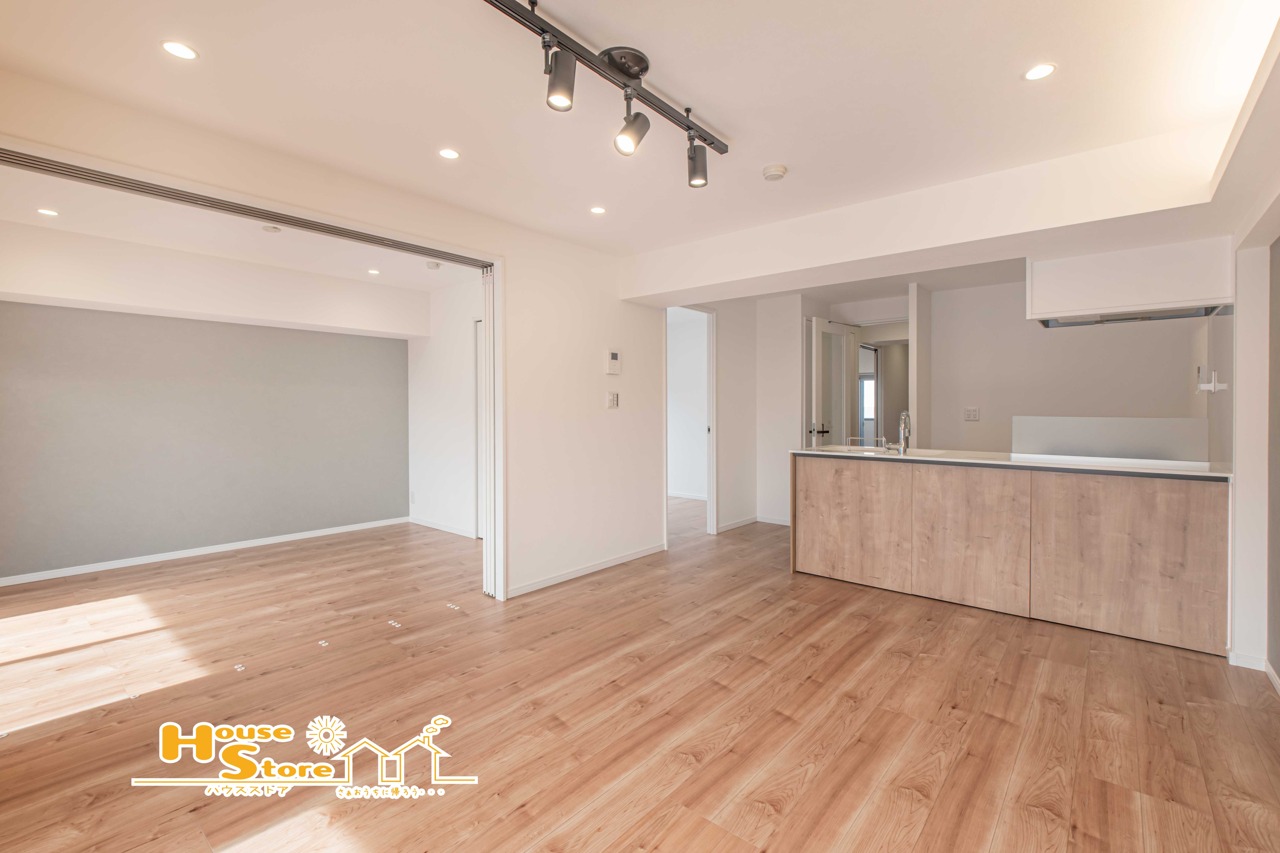 約12.9帖のLDK。オープンキッチン仕様で開放感があり、隣接する洋室の扉を開ければ一体感のあるゆとり空間が広がります。