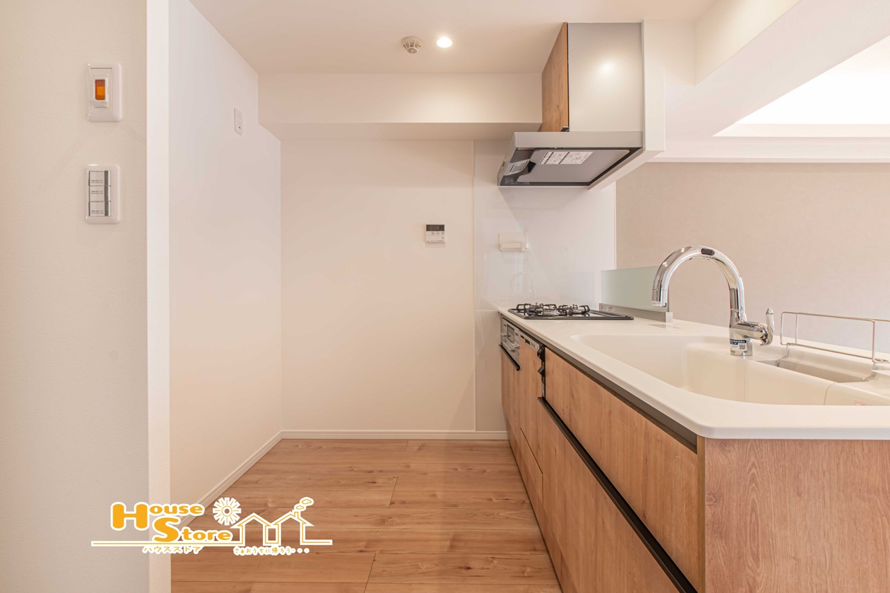 横幅約210cmのフルフラットキッチンを採用。ゆとりある横幅と開放的なデザインで、リビングとの一体感を感じられる上質な空間です。