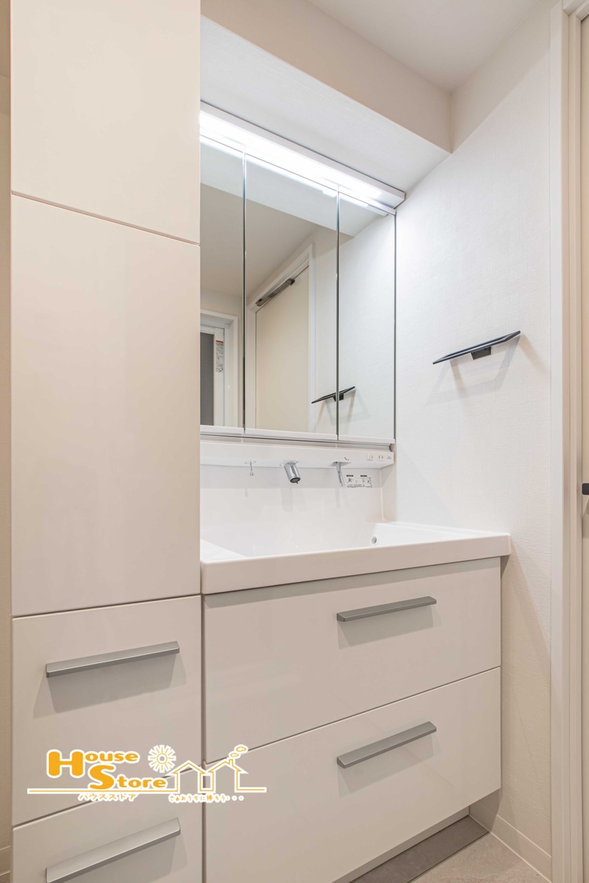 三面鏡の洗面台は収納力も魅力。鏡面収納やリネン庫が充実しており、バスタイムや身支度の際にも洗面スペースをすっきりと使えます。