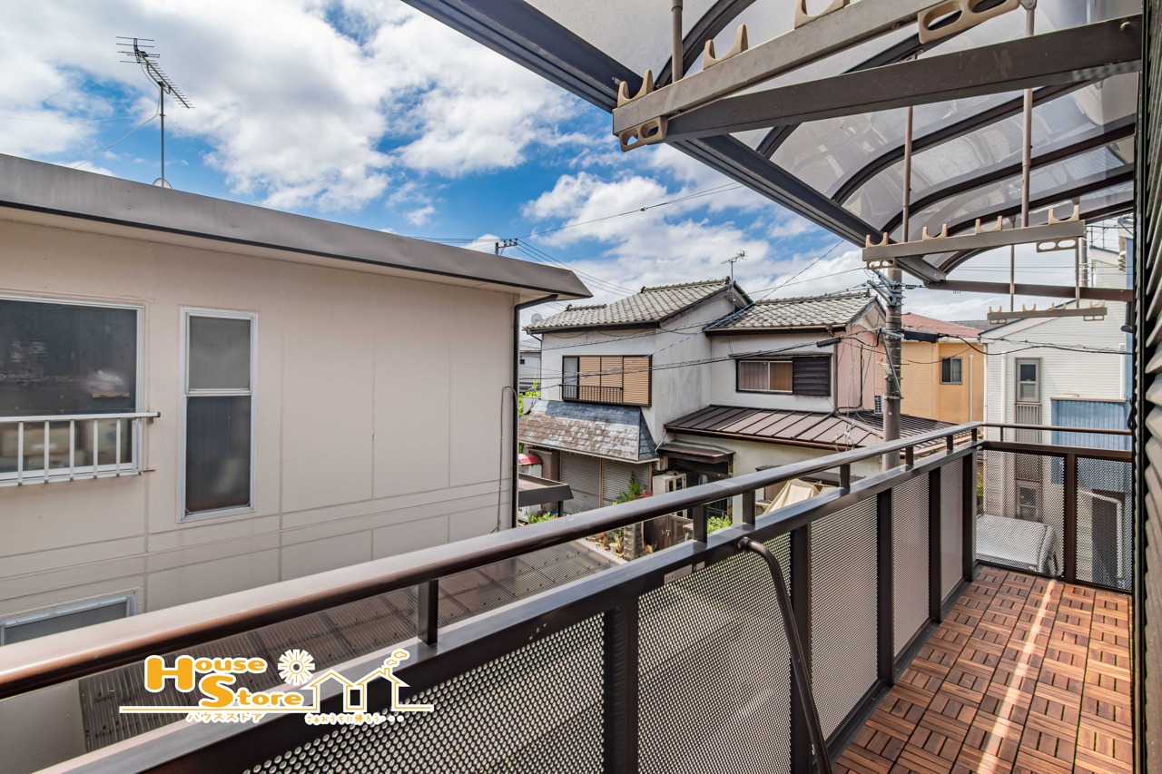 バルコニーには屋根が設けられており、少しの雨なら洗濯物を守ってくれるため、外出時も安心して干すことができます。南向きで日当たり・風通しともに良好な、心地よいバルコニーです。