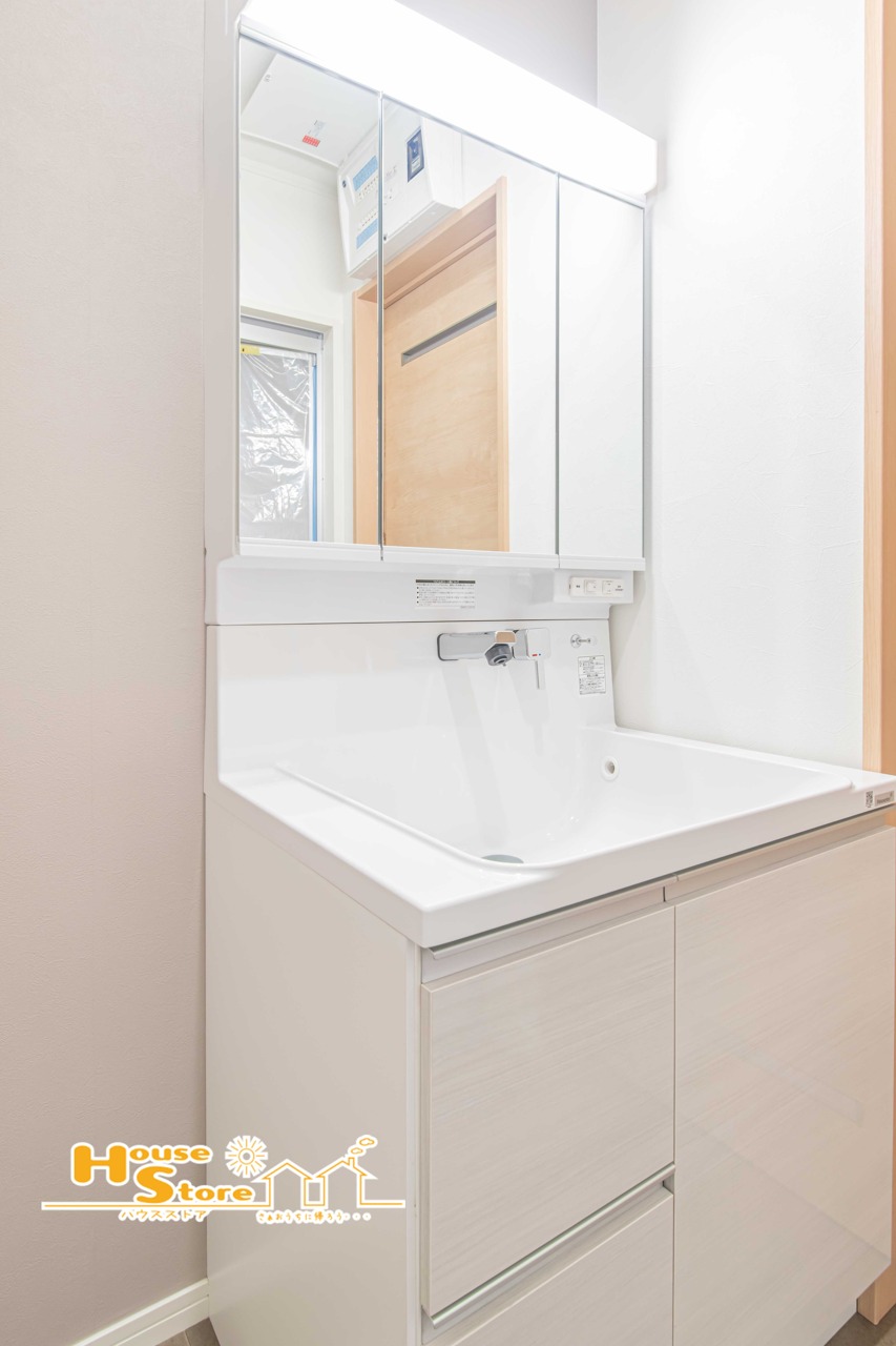 身支度に便利な三面鏡付きの洗面化粧台を採用。鏡裏のキャビネット収納に加え、足元の収納棚で散らかりがちな洗面スペースもすっきりと保てます。収納棚の一部は引き出し式になっており、物の出し入れもスムーズ。使い勝手の良い設計が魅力です。