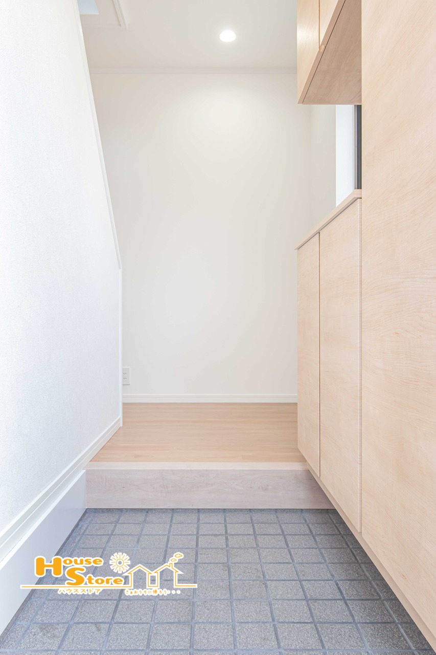 窓からの自然光が差し込む明るい玄関には、上下セパレートタイプのシューズボックスを設置。中央にはカウンターとしても活用できるスペースがあり、インテリアのディスプレイや鍵置きなどにも便利です。お住まいの「顔」にふさわしい、明るく清潔感のある玄関空間となっています。