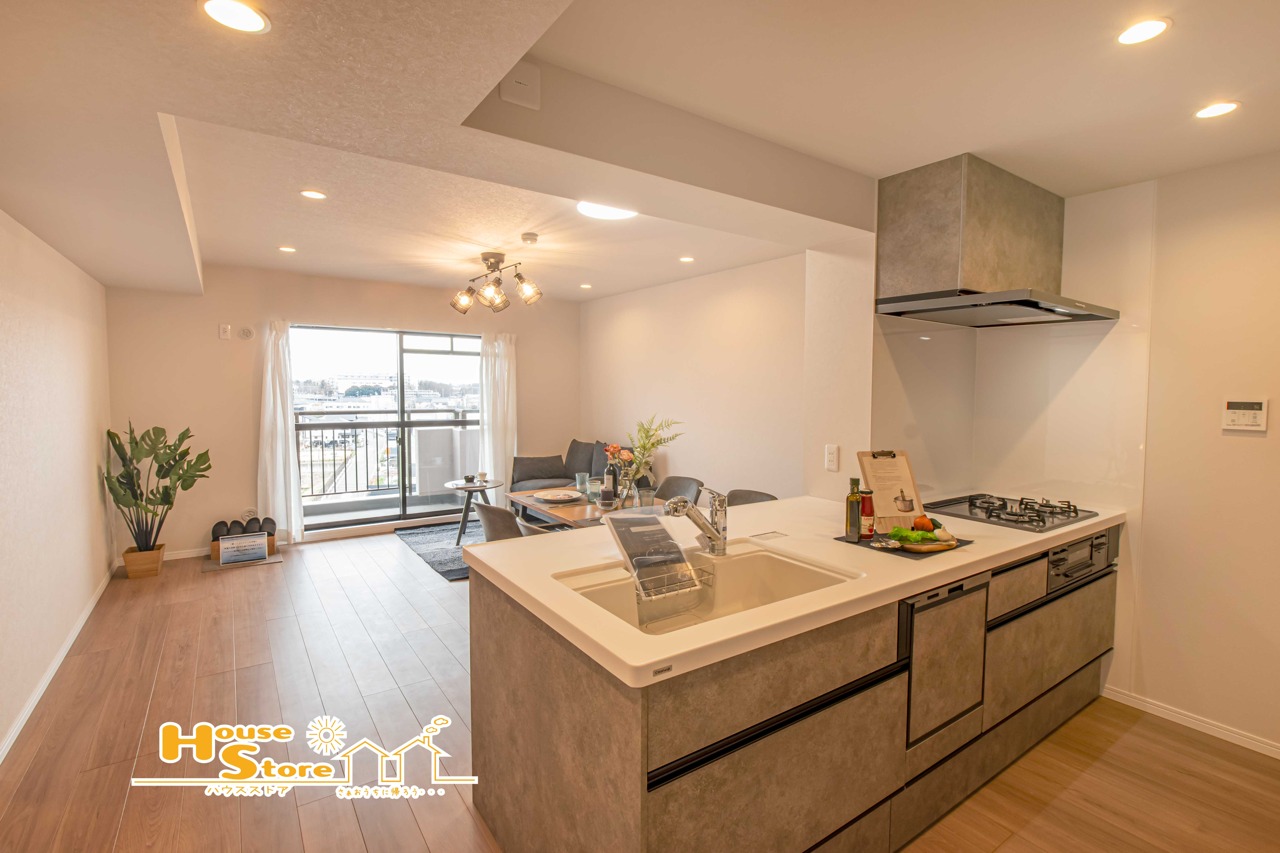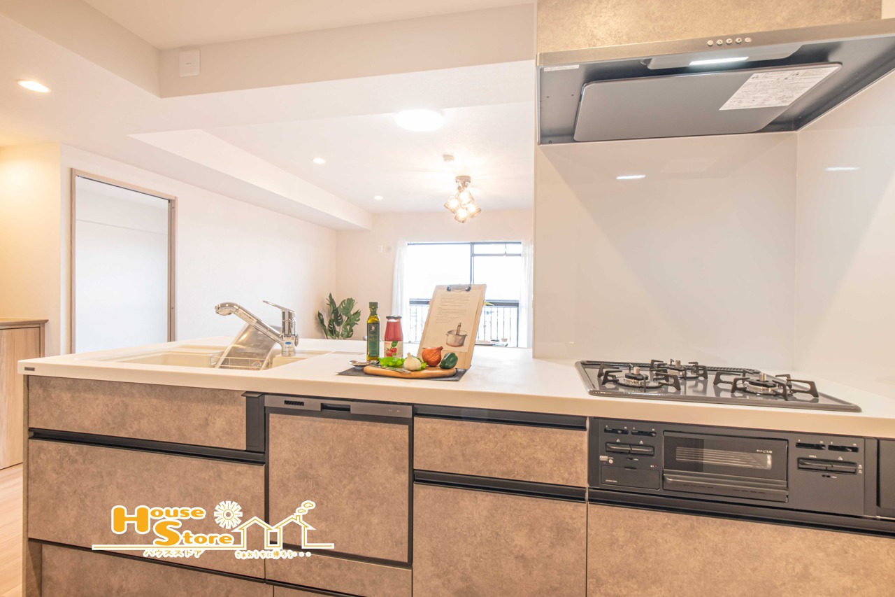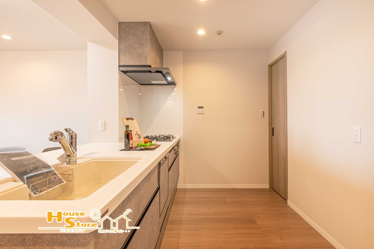 ゆとりのあるキッチンスペースで、料理中もスムーズに動ける快適な空間です。開放感のある設計も魅力のひとつです。