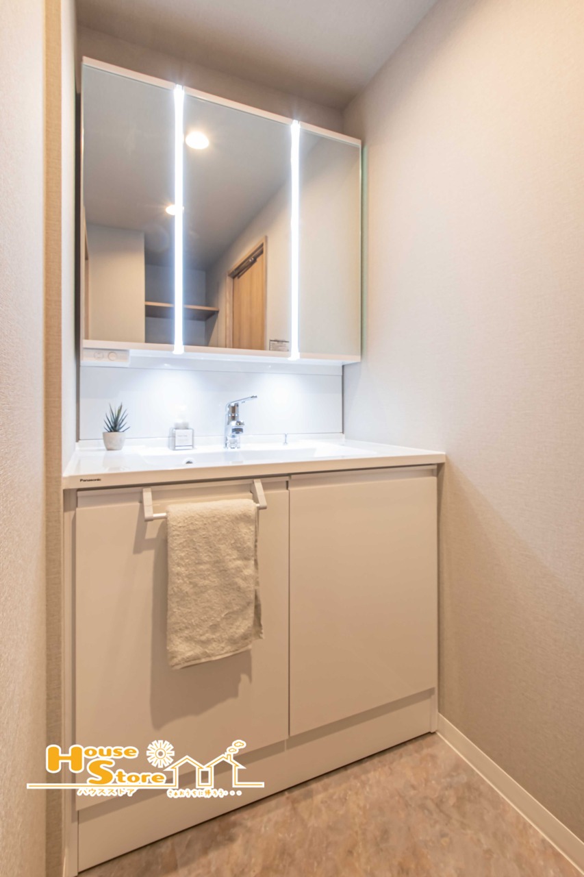 三面鏡付きで使いやすい洗面化粧台。鏡裏収納なども備え、細かなアイテムもすっきり整理できます。