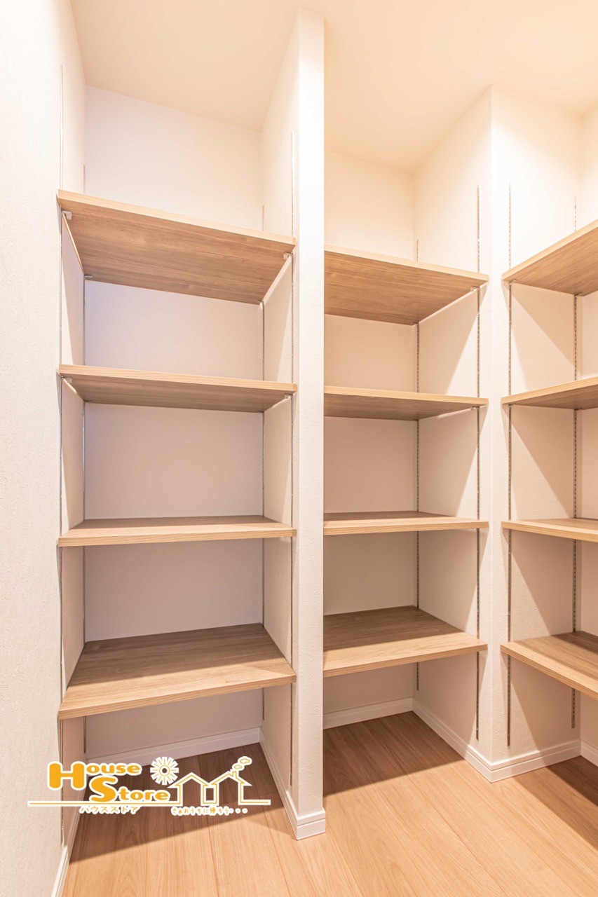 大容量のパントリーを完備。キッチンまわりをすっきり保てます。可動棚仕様で、使い勝手にも配慮された収納空間です。