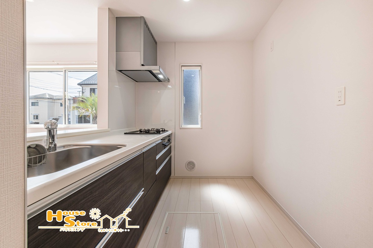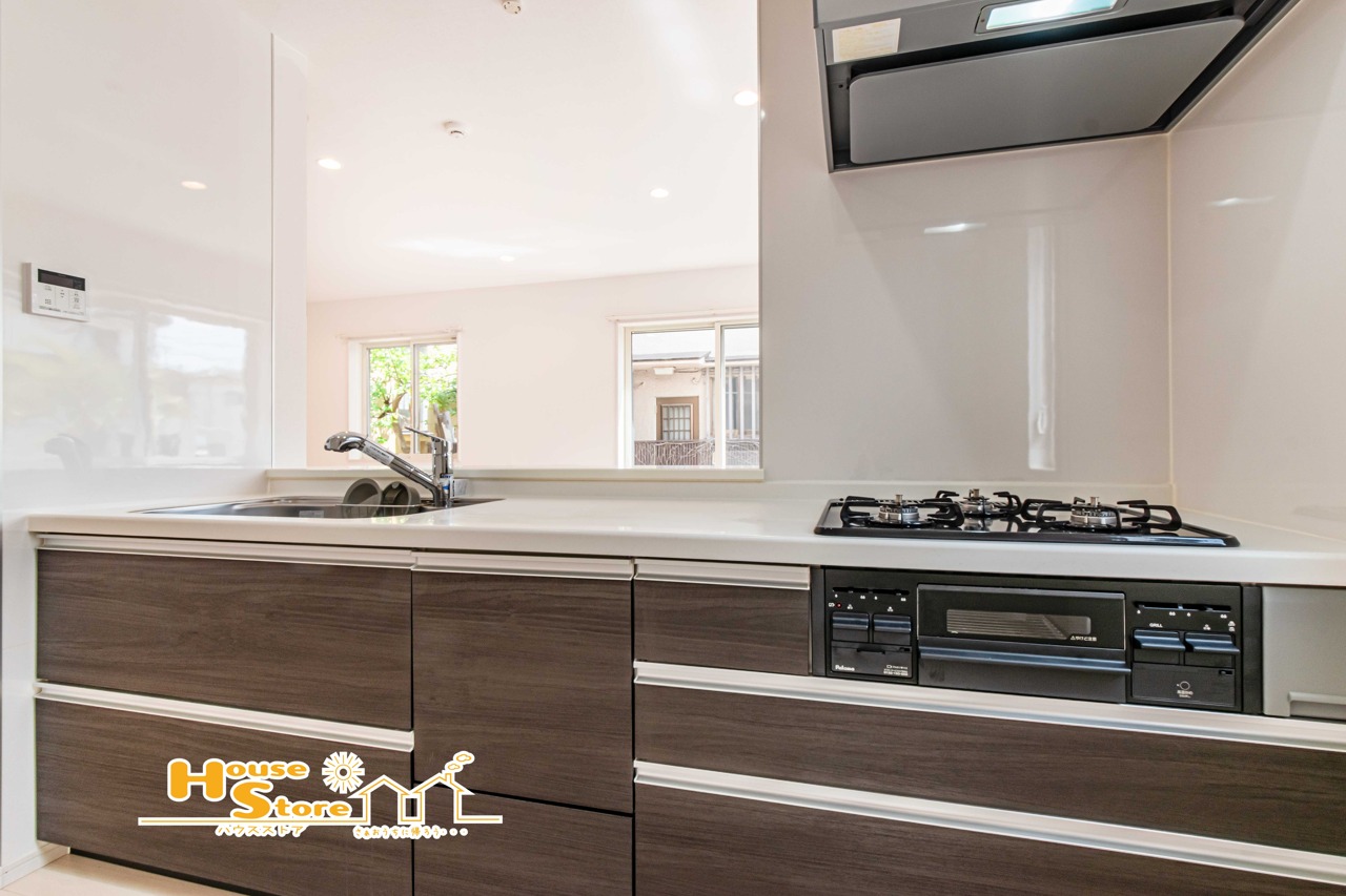 機能性に優れたシステムキッチンで、お料理も快適に。リビングの様子が見えるカウンターキッチンは、ご家族との会話が自然と生まれ、配膳や片付けもしやすい使い勝手の良い設計です。