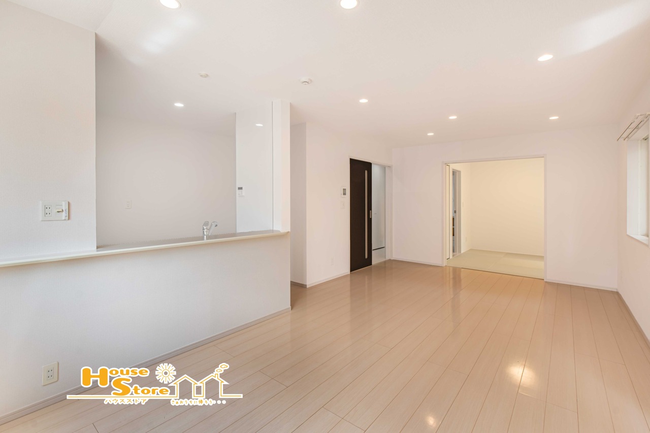 約18帖のLDKは、ご家族でゆったりと過ごせる程よい広さ。奥の和室を開放すれば、さらに奥行きと開放感が広がる空間としてお使いいただけます。