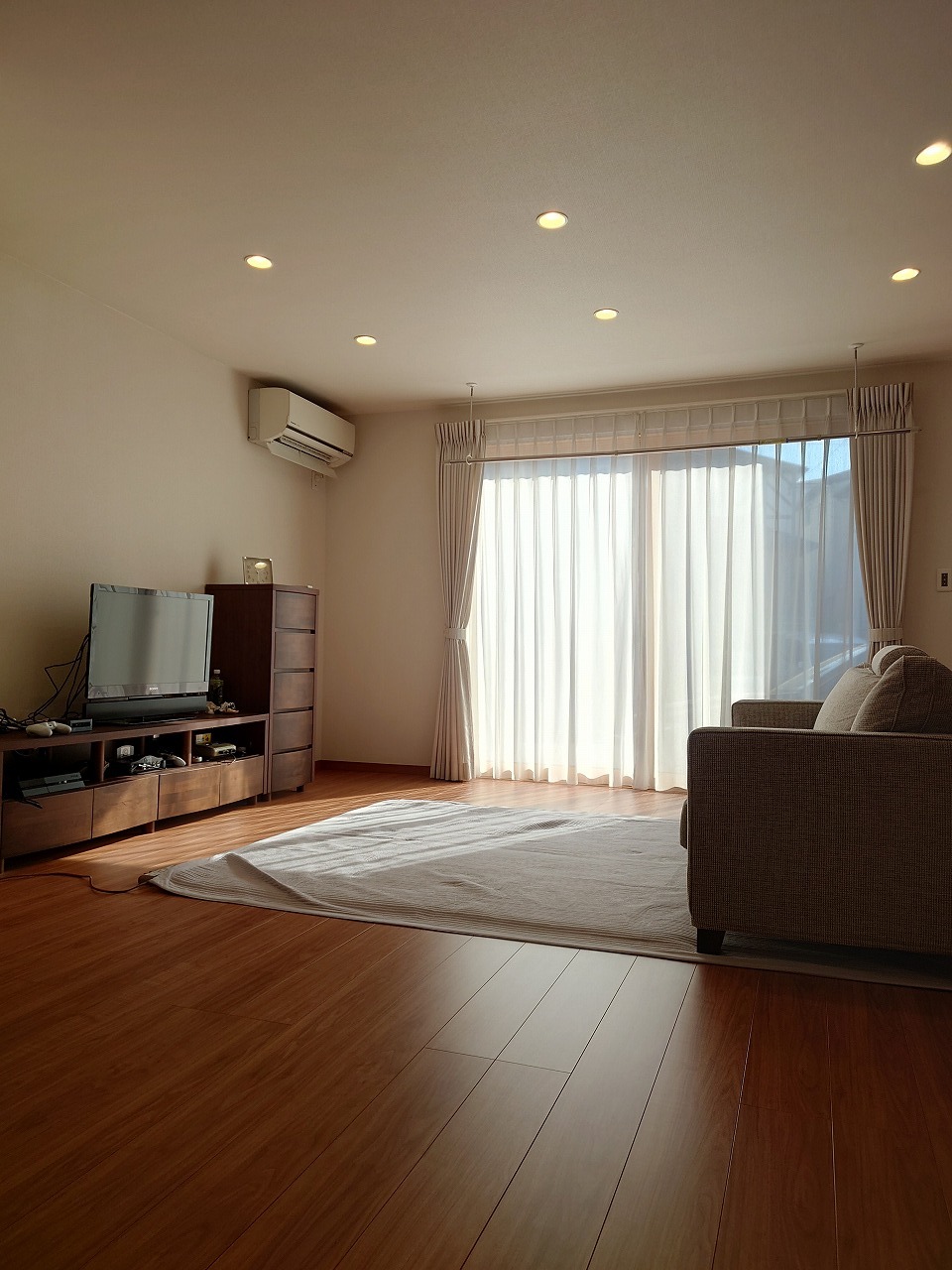 あたたかな日差しが降り注ぐ居心地の良いリビング。自然と会話が弾む設計は、住む人に笑顔を届けたいという想いが込められています。