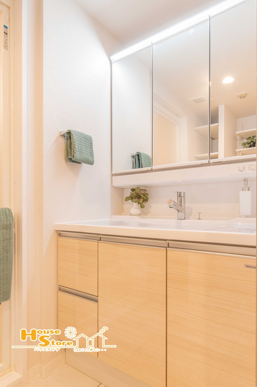洗面化粧台はキャビネットや収納にドライヤーや洗顔具、タオルをコンパクトにまとめることができ、朝の身支度もスムーズにできます♪